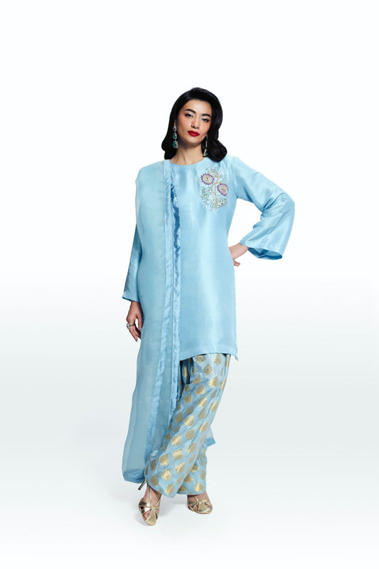An silk shirt, richly embellished with intricate zardozi craftsmanship featuring dabka, nakshi, sequins, betki, beads, and fine thread work. Heavily...