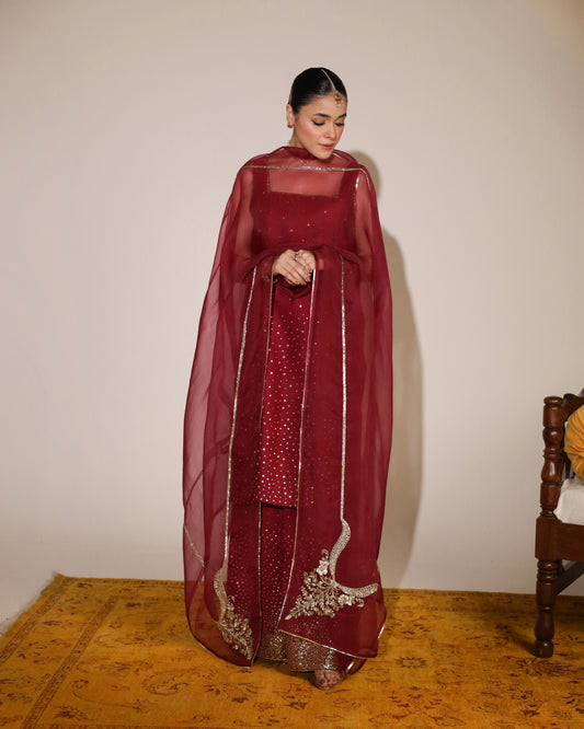 Material: Organza and Chiffon (silk lining). 2-Pc (Straight Kameez & Gharara)n Ochre organza adda work shirt with silk lining...