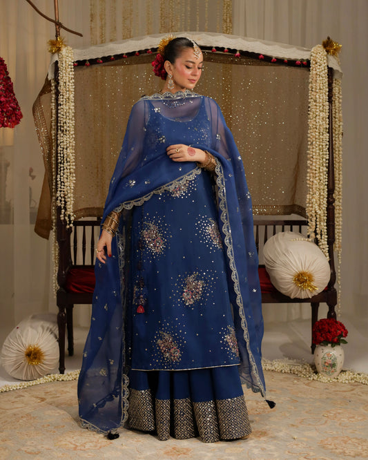 Material: Bamber Silk. 2-Pc (Straight Kameez & Sharara) Cobalt Blue bamber silk shirt and sharara with tilla and resham...