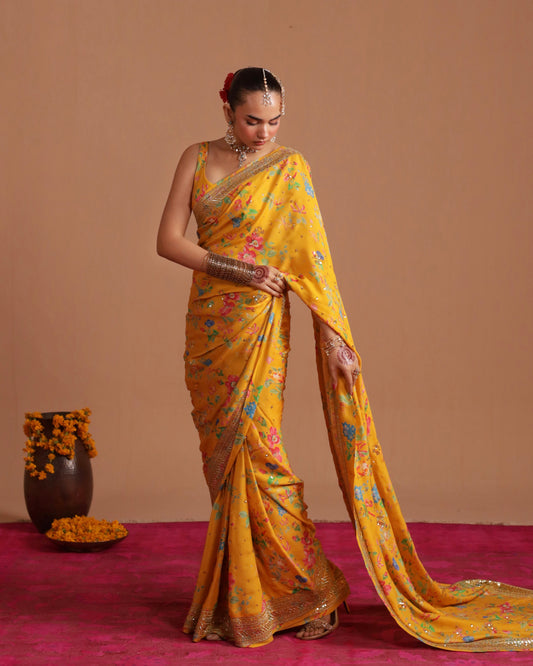 Material: Shamooz Silk. 3-Pc (Blouse, Petticoat & Saree) Digital Printed Mustard shamooz saree with tilla and sequin embroidery.