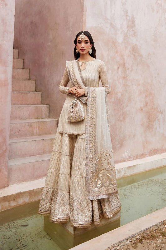 Exploring classic silhouettes, Kaia is a masterpiece. The off-white chiffon shirt and karandi gharara feature...