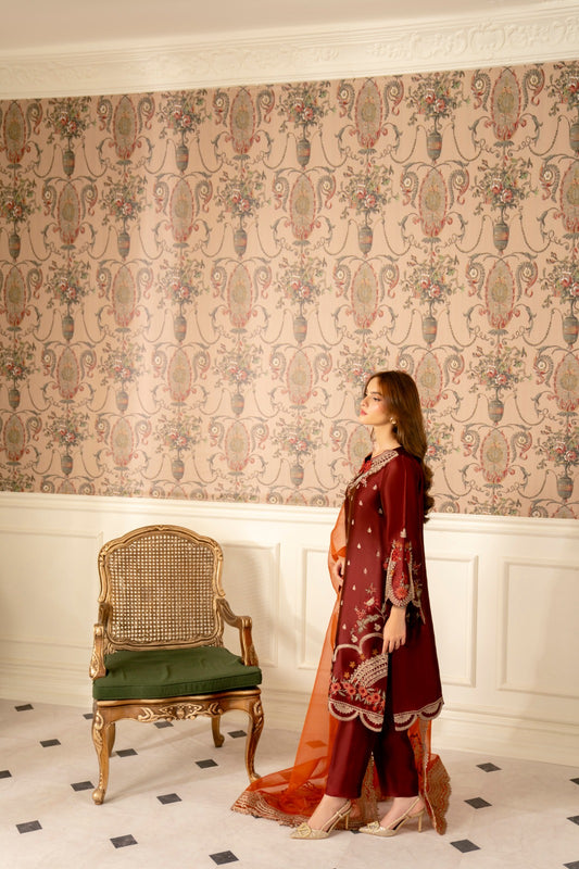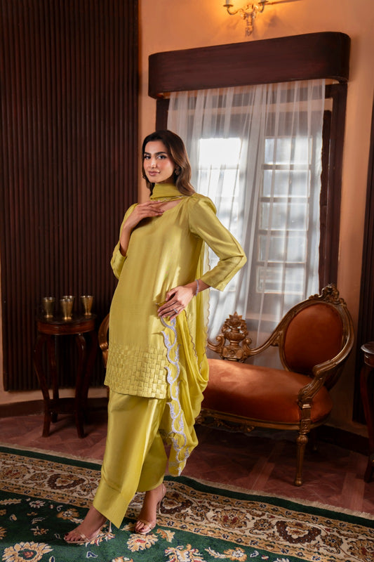 Shirt (35") Shalwar (38") Dupatta (3 yards) Fabric Details: Shirt: Korean Silk Shalwar: Korean Silk...