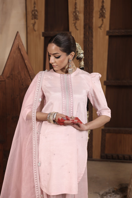 Product DetailShort ShirtShalwarDuppataFabric Details: Raw Silk, Organza
