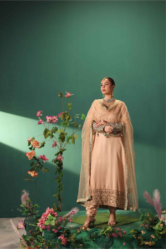 A flowing silk shirt in beige tone, delicately detailed along the sleeves and hem with intricate butterwork. Paired with...