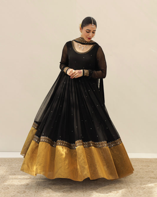 Anarkali with Lining Churidar Dupatta Anarkali Fabric: Chiffon + Golden Tissue Lining + Churidar Fabric: Raw Silk Dupatta...