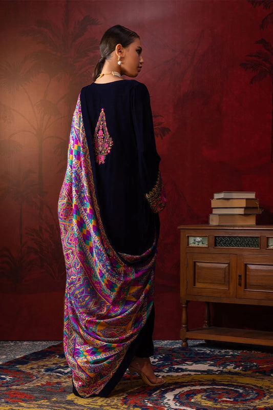 This exquisite ensemble is a masterpiece of craftsmanship. The deep blue chiffon shirt, adorned with...