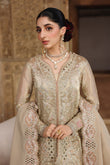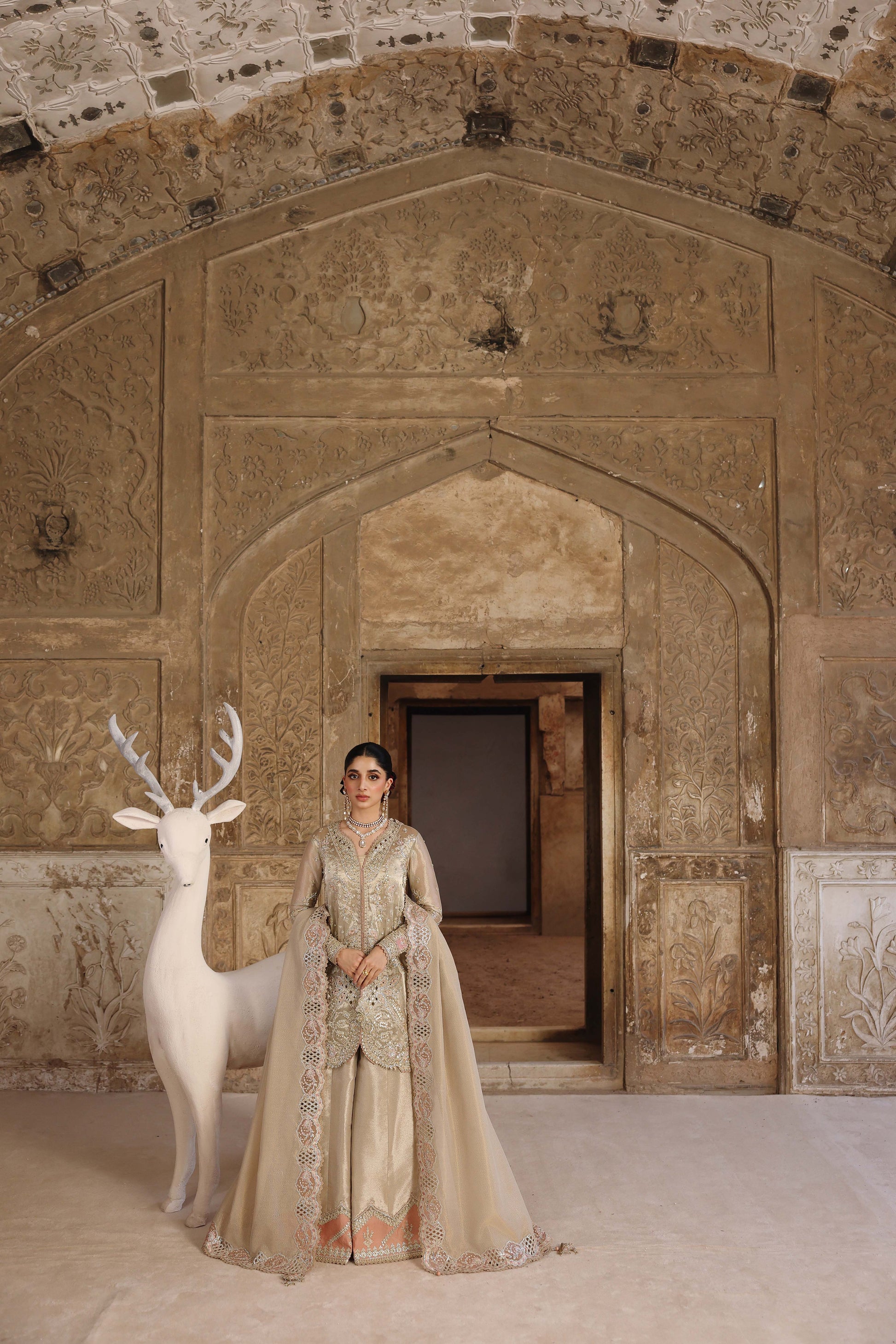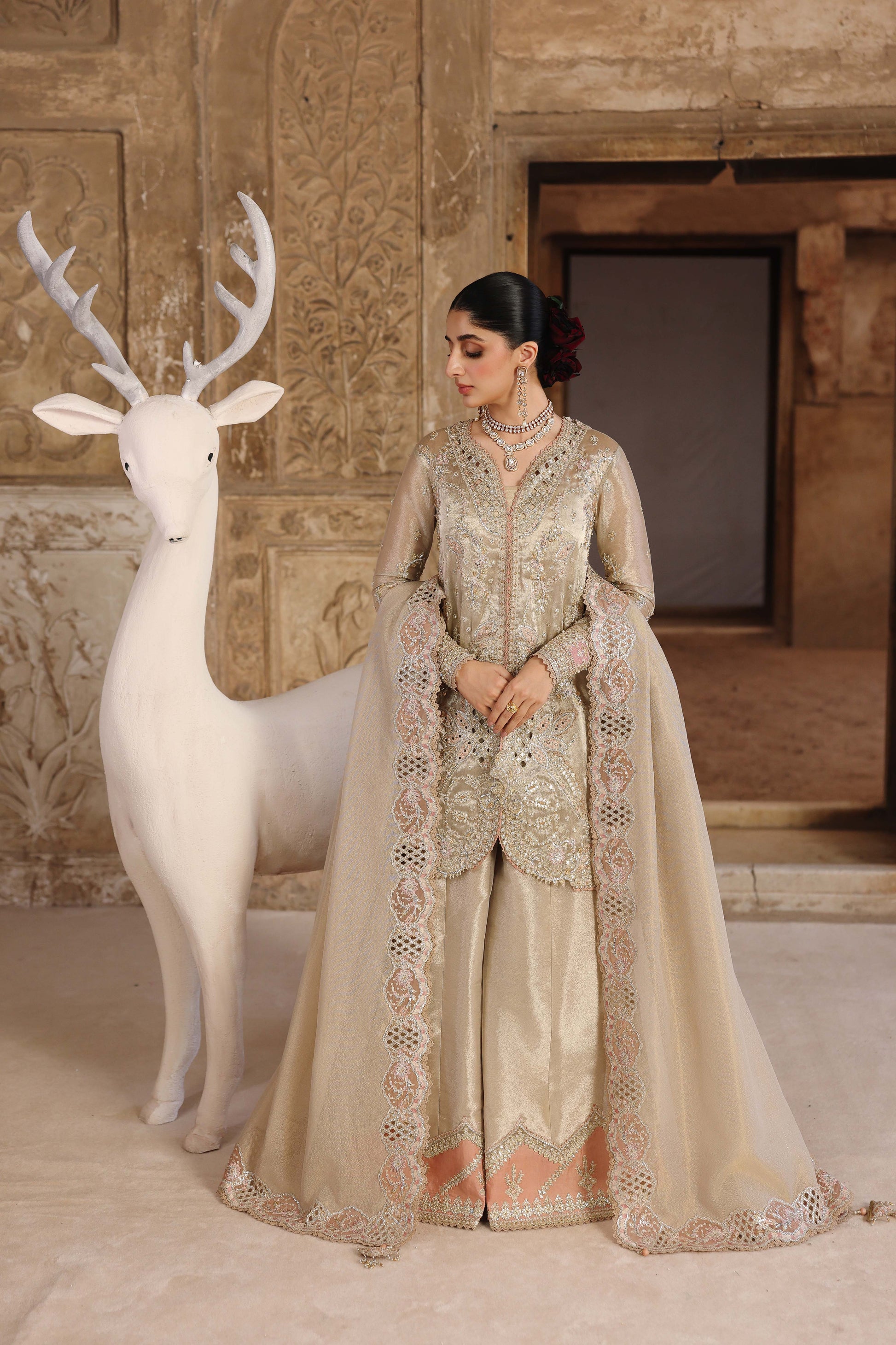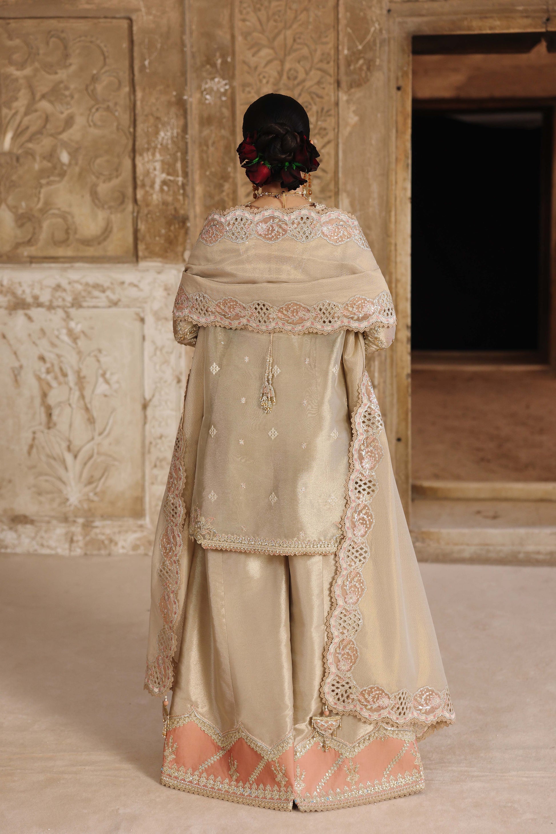 The ensemble is completed with a mesmerizing Jacquard Weaved Dupatta, featuring an embroidered four-sided border and delicate gotta tassels that elevate its festive charm. The Zari Tissue Sharara is embellished with a charmeuse silk embroidered border and fine laces, creating a graceful flow—perfect for weddings, festive evenings, and luxury events.