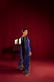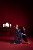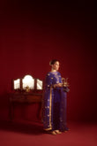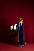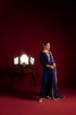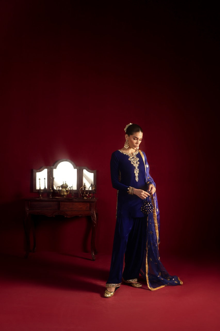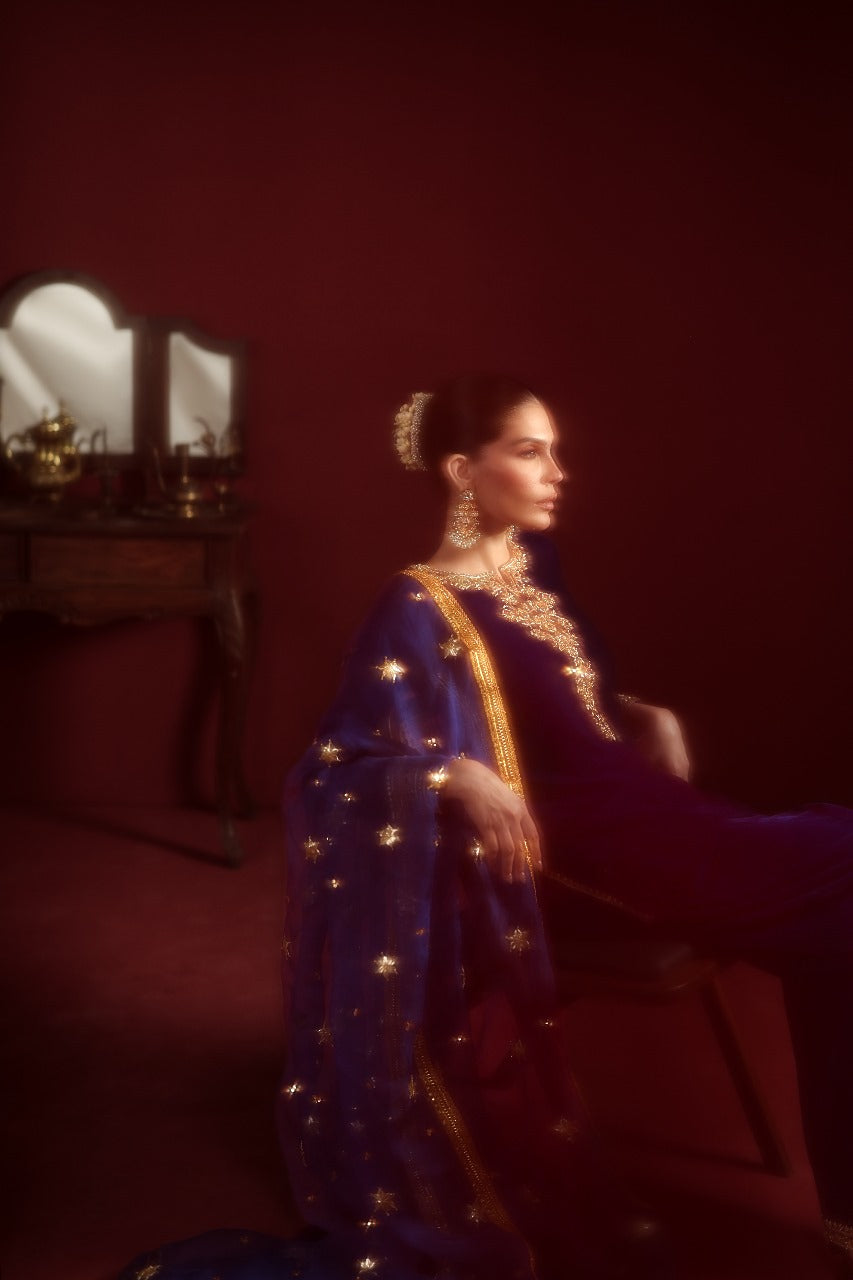 Crafted in luxurious velvet and organza, this ensemble captivates with its rich hue and exquisite detailing. The short velvet shirt features hand-embellished work along the neckline and chaak, a hallmark of classic MDR artistry. Gota-adorned sleeves bring a traditional charm, balancing elegance with festive brilliance.