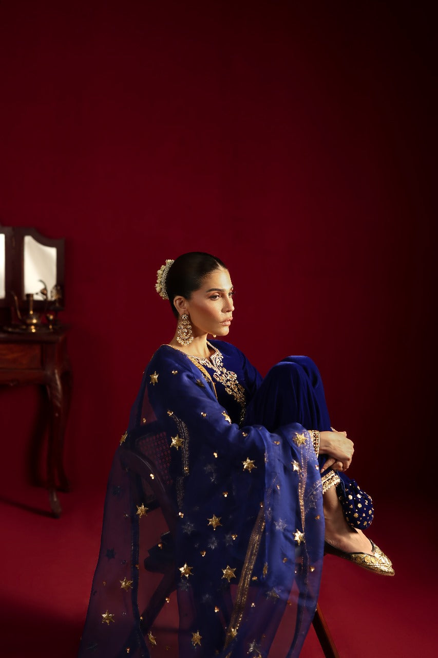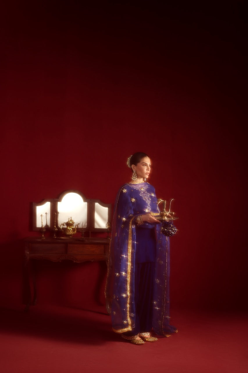 Paired with culotte pants featuring delicate handwork, the set offers a refined yet contemporary silhouette. The look is beautifully completed with an organza dupatta finished with star-shaped gota pattis, adding a playful glimmer to every movement.