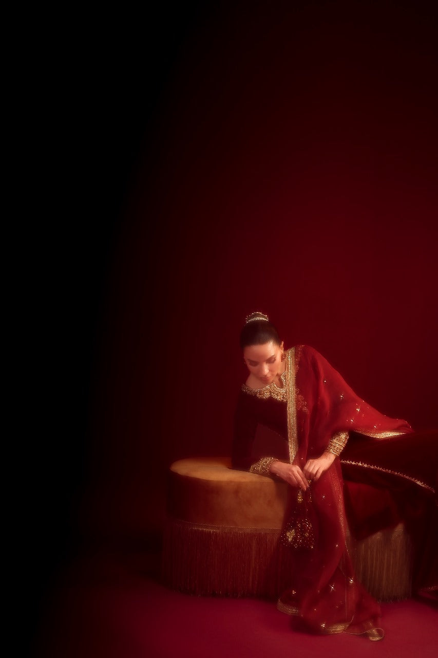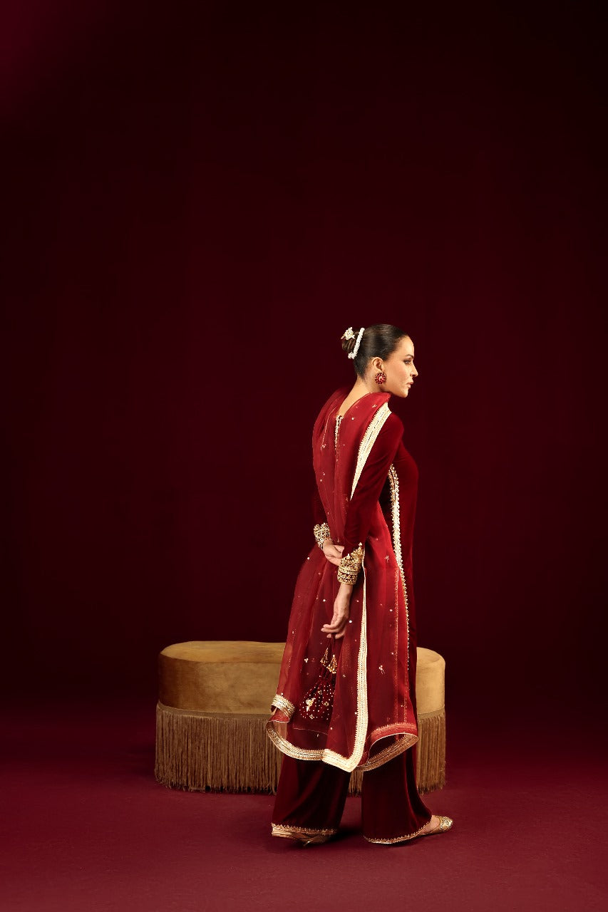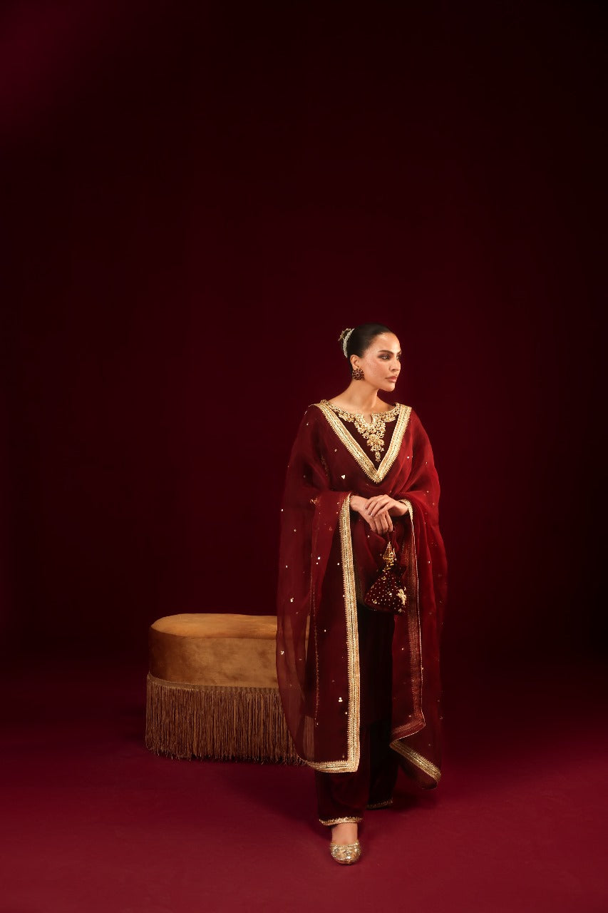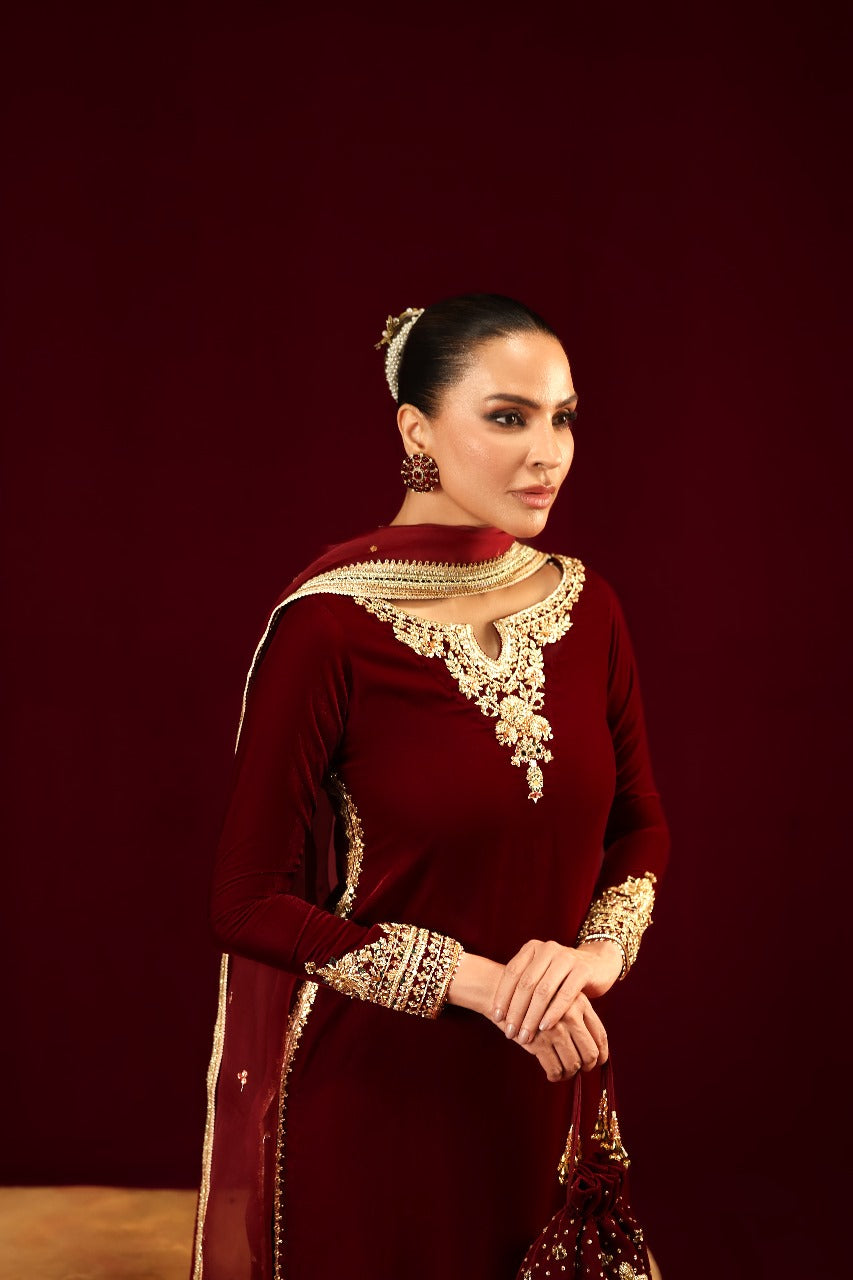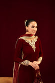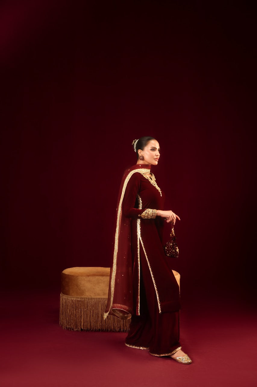Rich, regal, and timeless — this maroon velvet ensemble is crafted to make an unforgettable statement.