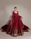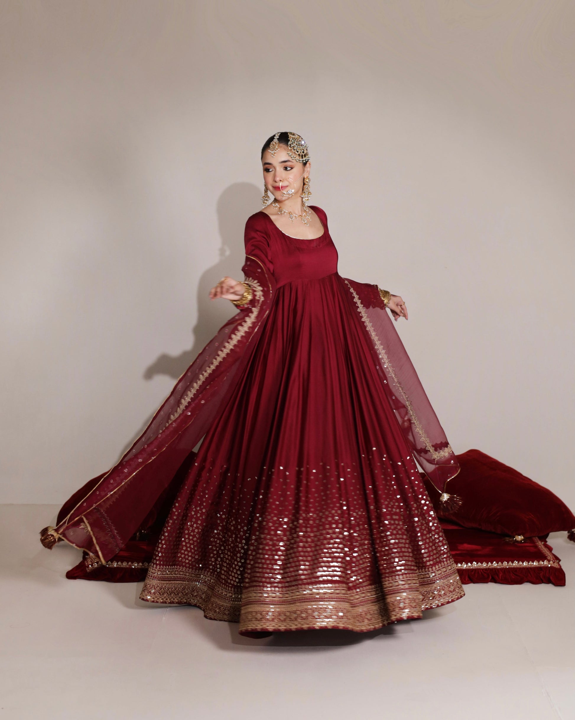 Material: Shamooz Silk. 2-Pc (Kali Daar Anarkali & Churidar) Anari Redshamooz Silk anarkali adorned with sequins and tilla embroidery and a heavy back tassel paired with a churidar trouser and organza embroidered and tasseled dupatta.