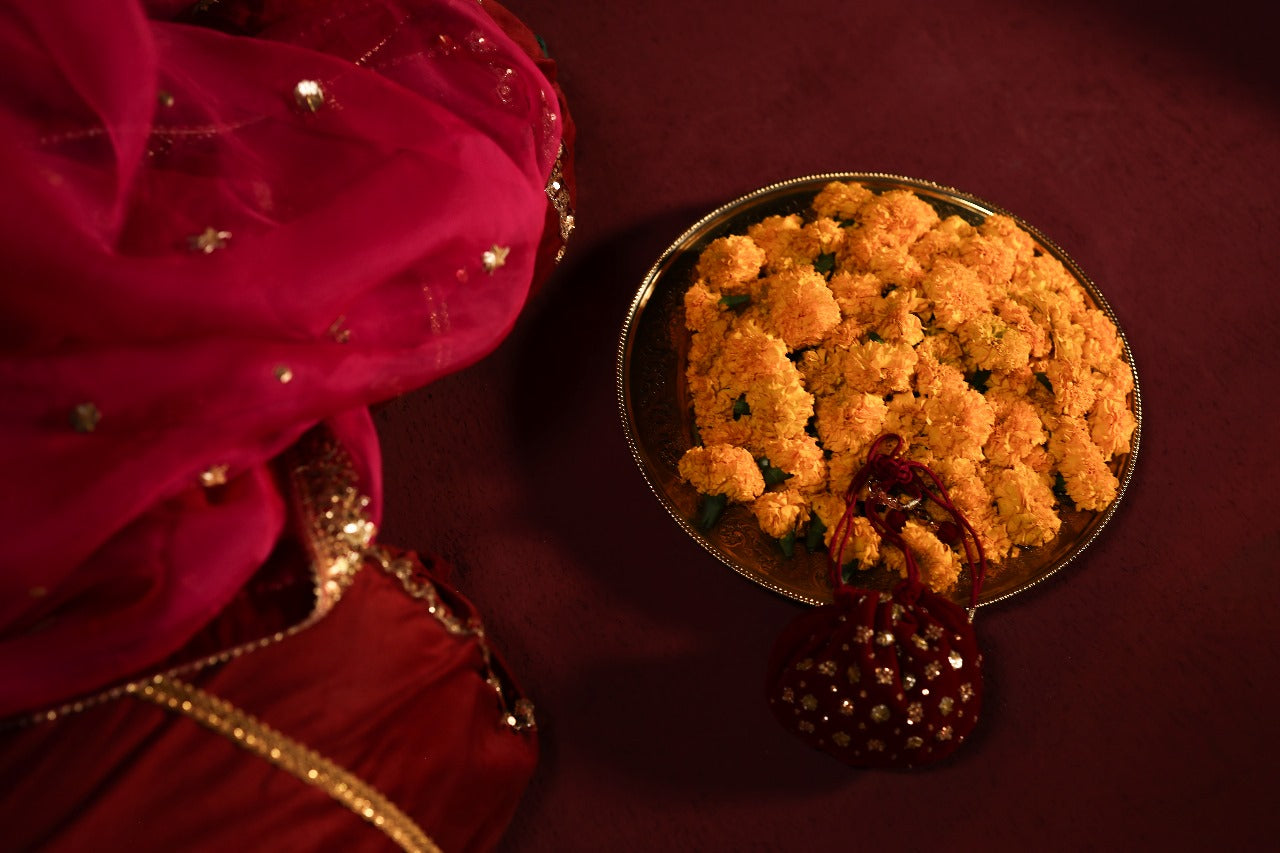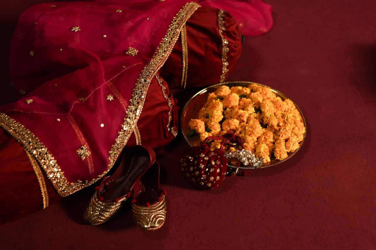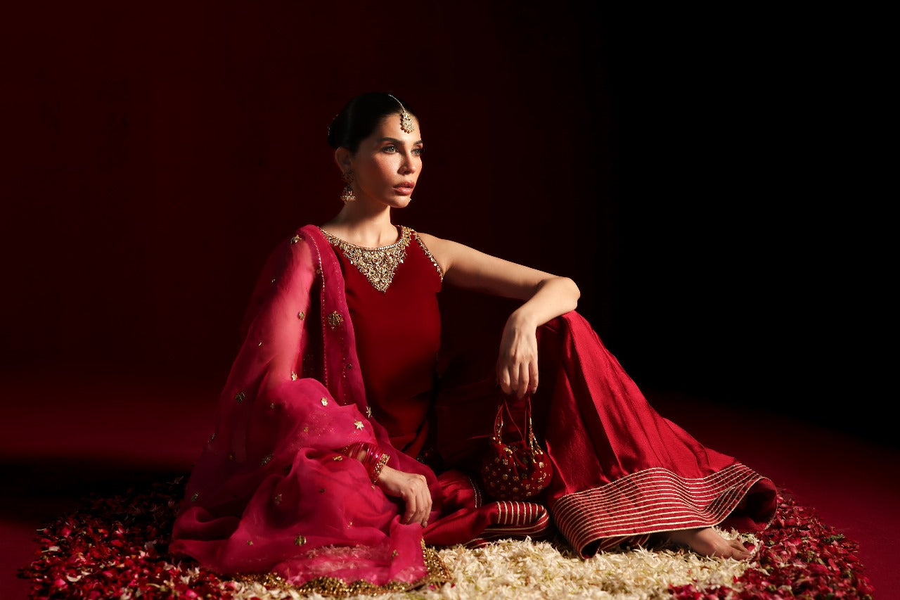 Includes: Hand-embellished Short Shirt, Gota Silk Pleated Skirt, Heavy Organza Dupatta