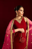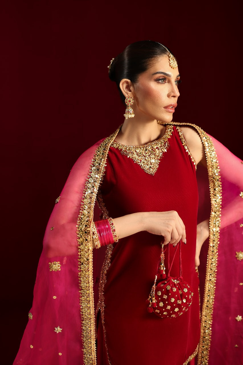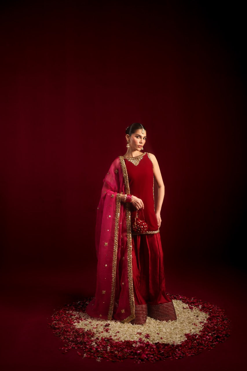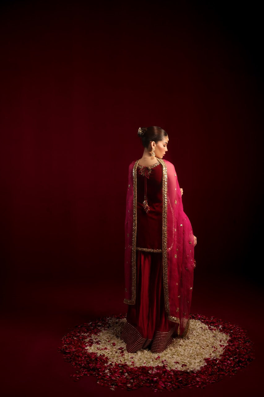 Cut from plush velvet, the short shirt features an intricately hand-embellished neckline with delicate craftsmanship extending across the chaak and daaman for a rich, luminous finish.