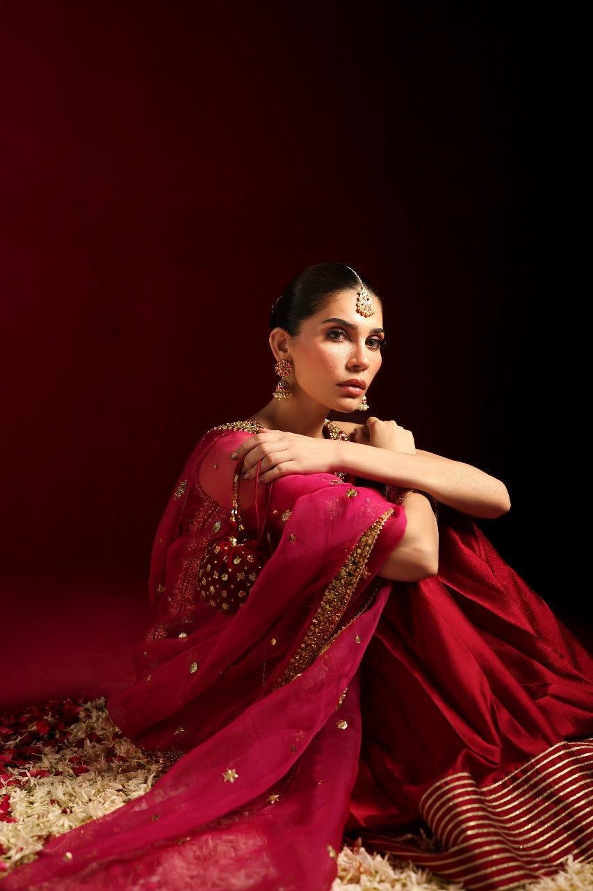It is paired with a pleated two-legged silk skirt, adorned with a refined gota border that adds movement and subtle grandeur to the silhouette. Completing the look is a beautiful, heavily worked organza dupatta—a versatile statement piece that elevates the entire outfit for weddings, festive soirées, and elegant evenings.