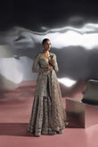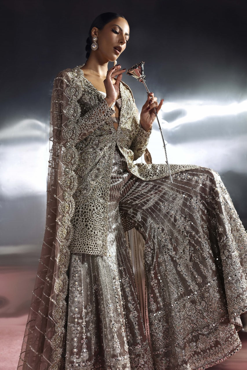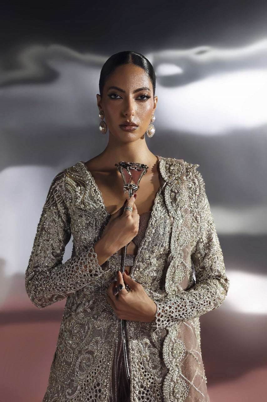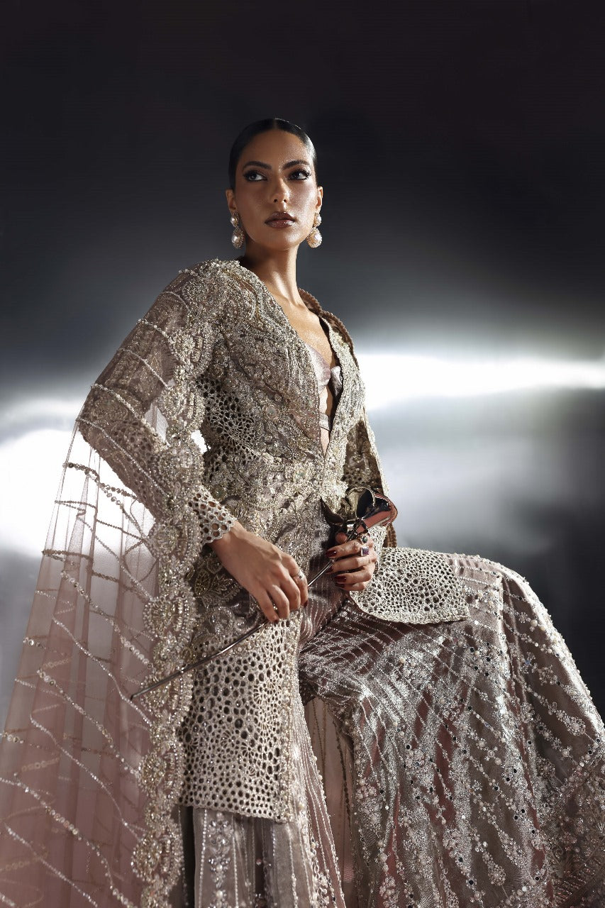 Astrell features a jacket and sharara crafted on a gun metallic tissue base. The outfit is intricately hand-embellished with fine detailing, paired with a net dupatta adorned with delicate cutwork. A statement look designed for modern celebrations