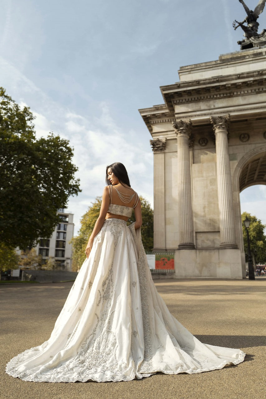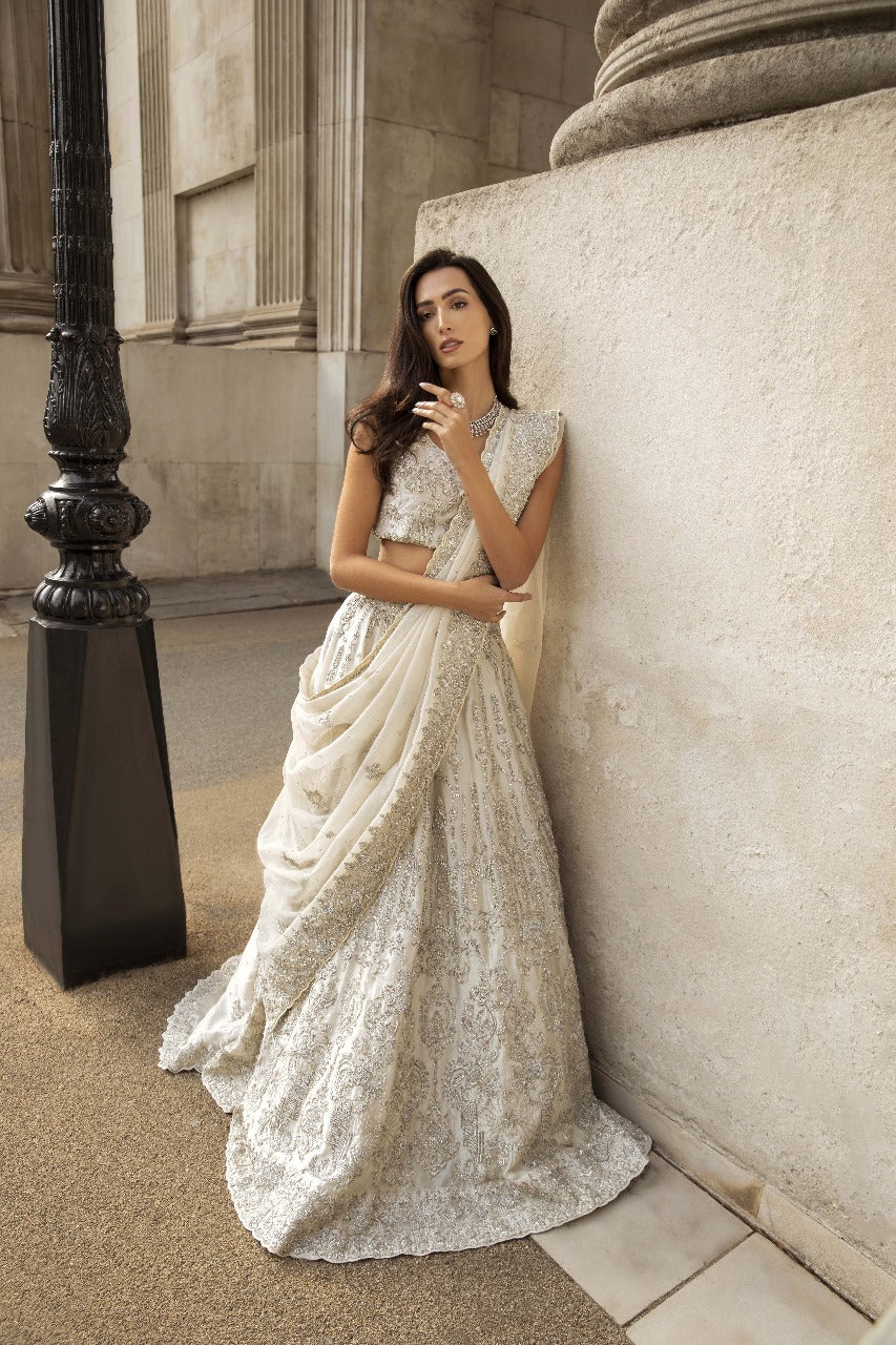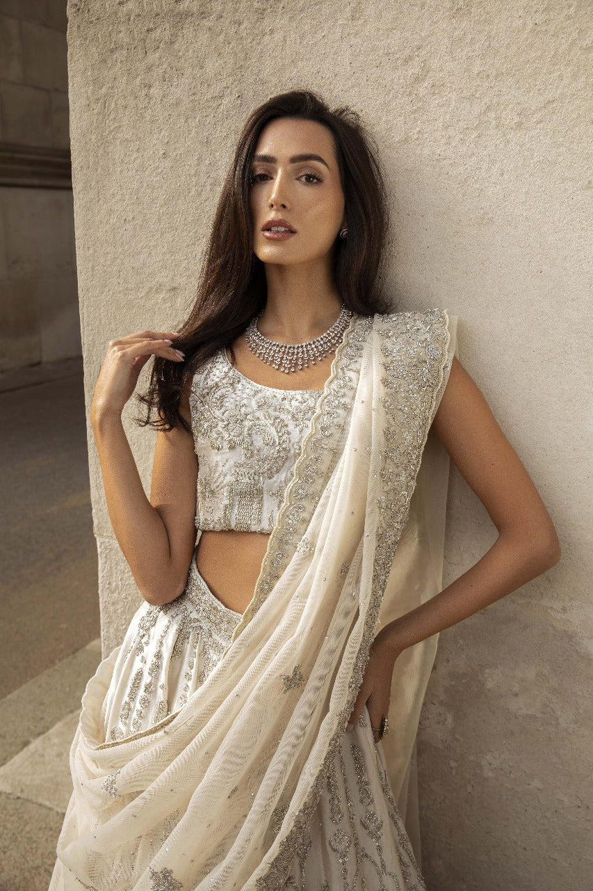 AVIA embodies effortless grace, designed for the bride who appreciates heritage but embraces modern minimalism. Dressed in a serene pearl white palette, this ensemble radiates purity, elegance, and timeless sophistication.