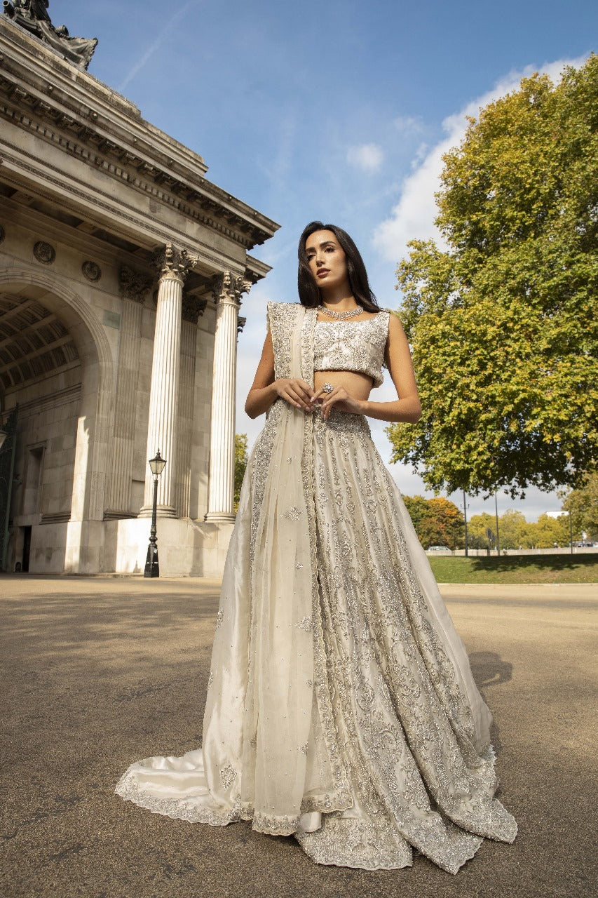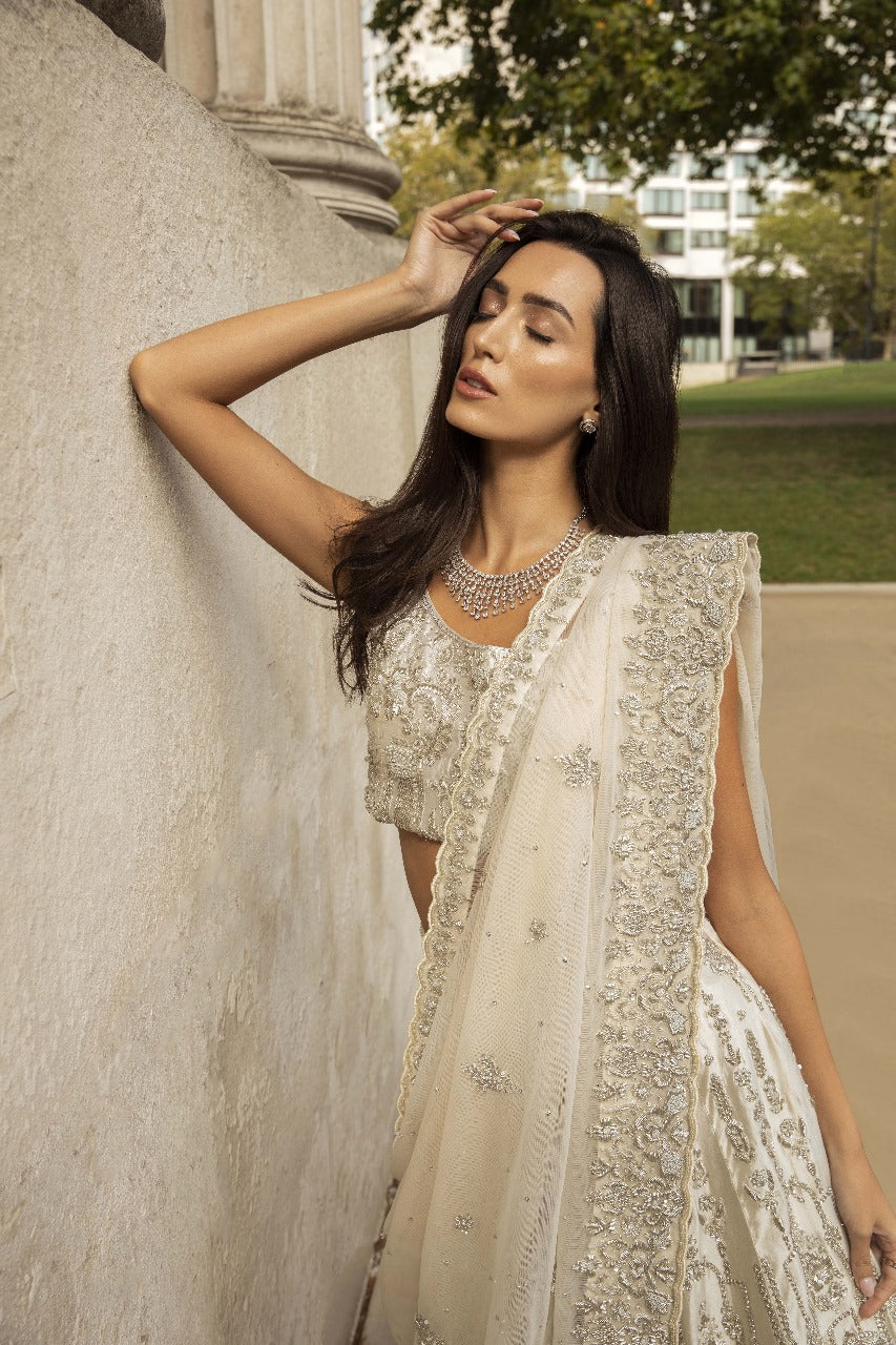 Crafted in luxurious sheesha silk, the outfit offers a soft sheen and fluid drape that enhances every movement. Paired with a delicate organza dupatta, AVIA delivers a look that is ethereal, refined, and irresistibly graceful.