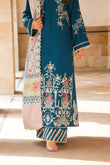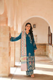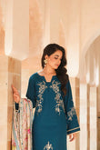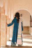 "Ayra" is a mesmerizing three-piece karandi outfit that carries whispers of radiance, woven with magical embroidery. The teal blue shirt and trousers are accented with hints of cream, pink, and green vintage embroideries, and paired with a florally printed, multi-hued dupatta, transcending a perfect trendy outlook.