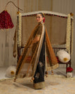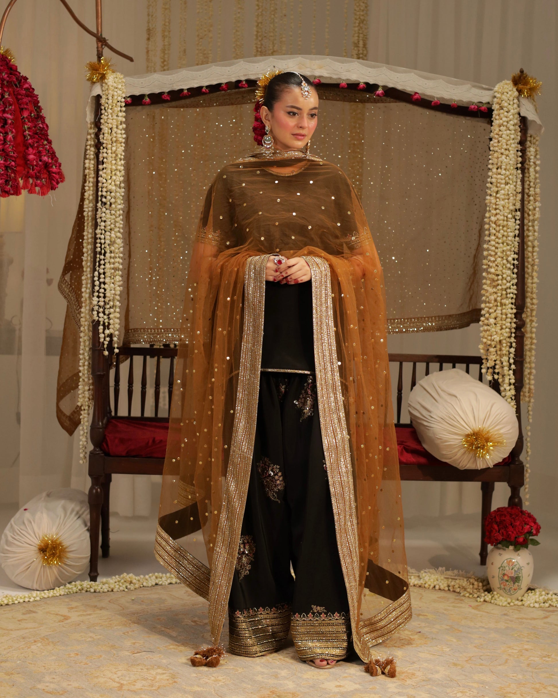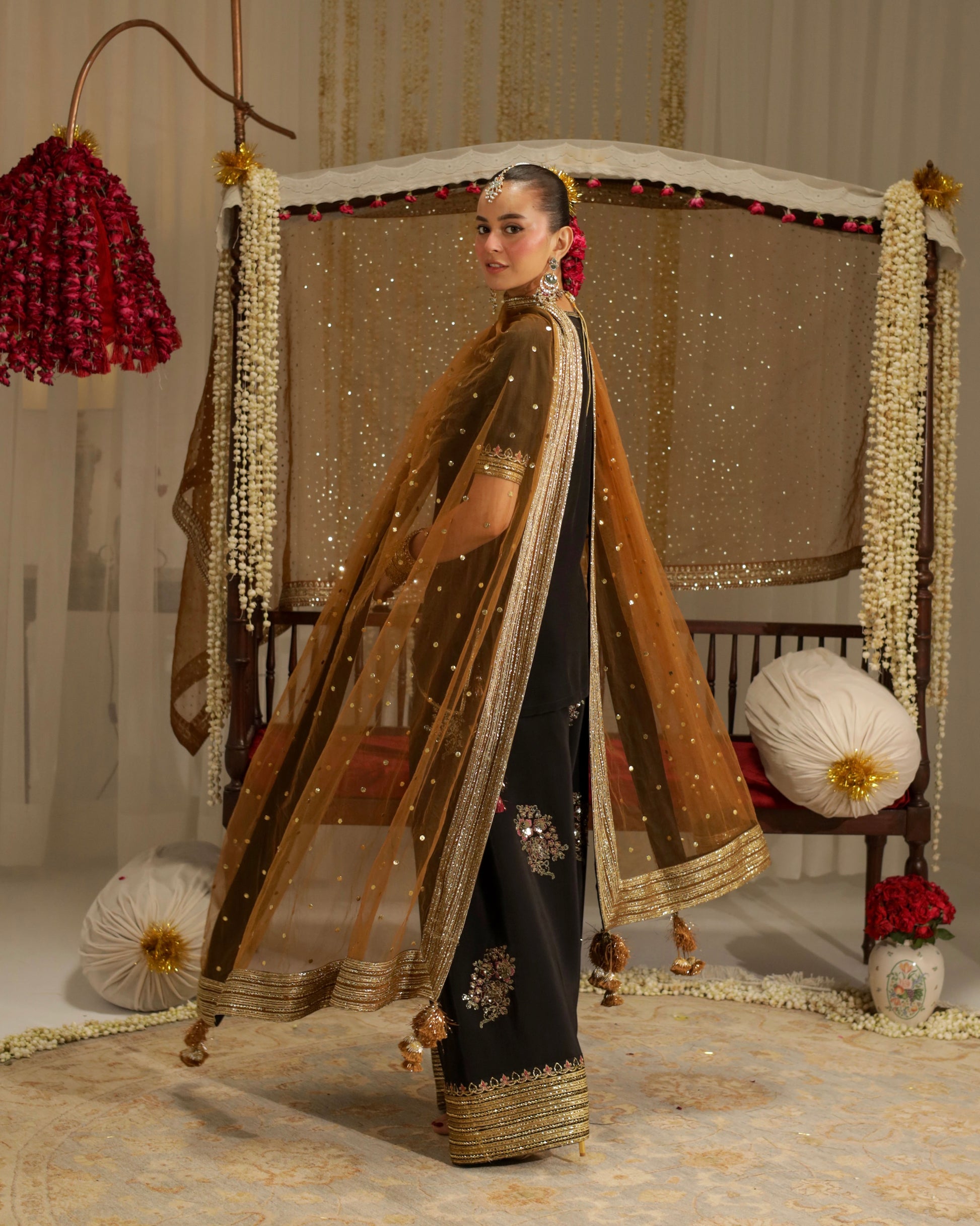 Black bamber silk shirt with badla and tilla embroiderypaired with farshi shalwarand a contrasting net mukesh dupatta.