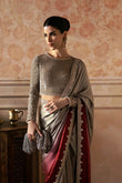 Captivating and chic, Caryn is truly one of a kind. Fashioned on a striking ombré red canvas, the silk saree captivates with its timeless silhouette and glistening pearl, sequin and tilla ornamentation. Paired with a heavily adorned velvet blouse, this piece is synonymous with old world glam and ensures you stay in the limelight every time.