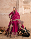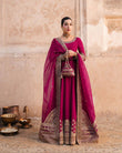 Redefining timelessness, Cassia is a breathtaking embodiment of vintage glamour. Crafted from luxurious Korean raw silk in a vivid burgundy hue, the pishwas makes a bold statement with its dazzling mirror and tilla work. The embroidery adds a sense of regal charm, while the rich fabric ensures a graceful drape and silhouette. This stunning ensemble is paired with an oak silk churidar, providing a classic contrast and elegant finish. To complete the look, an embroidered organza dupatta lends a touch of delicacy and finesse, making the outfit perfect for formal events and festive occasions.