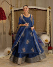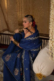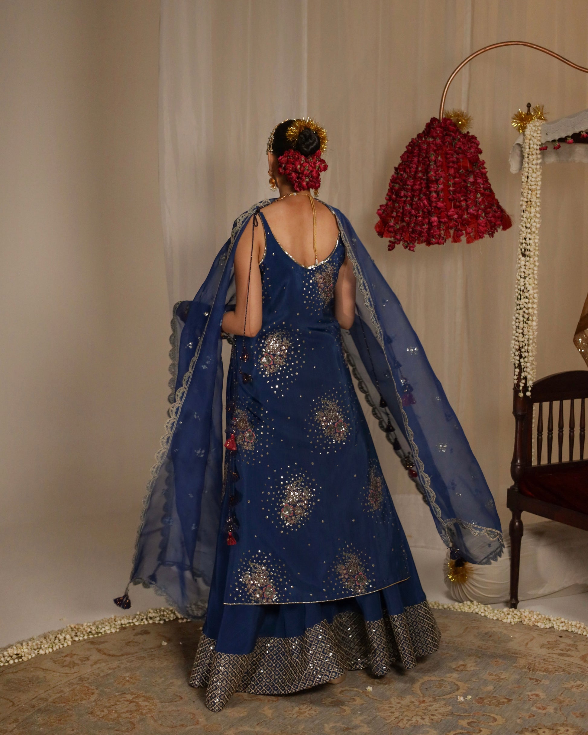Material: Bamber Silk. 2-Pc (Straight Kameez & Sharara) Cobalt Blue bamber silk shirt and sharara with tilla and resham embroidery highlighted with adda work and an organza dupatta.