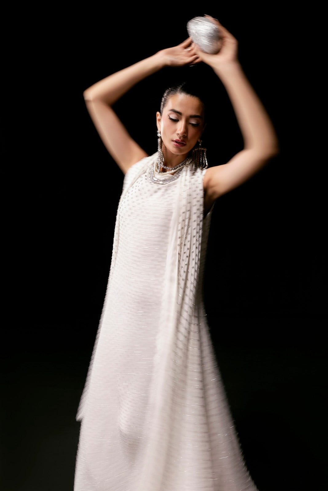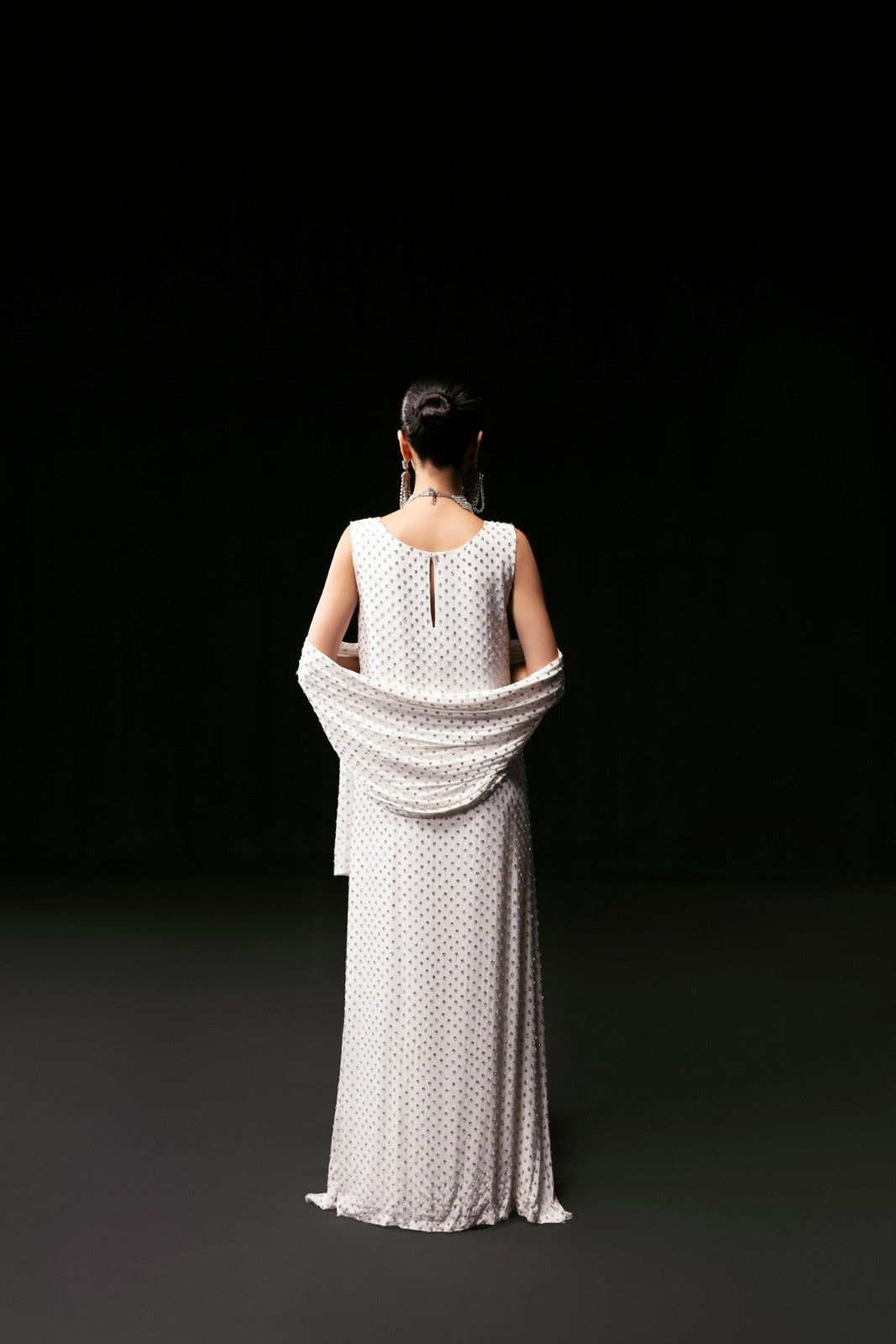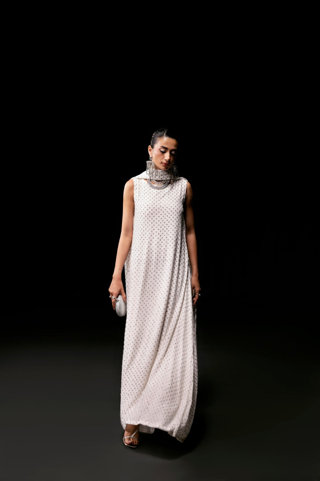 Elevate your elegance with Crystella, a pure grip maxi dress designed to captivate. Adorned with dazzling sparkling stones, it exudes glamour in every detail. Paired with a matching long stole, gracefully draped around the neck and embellished with shimmering stones, this ensemble offers the perfect blend of sophistication and sparkle ideal for making unforgettable statements.
