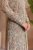 Dahlia is a modern technique masterpiece essayed in dull gold & skin shades curating an enchanted bridal piece. A mesmerizing net gown beautified with multi-hued pastel shaded work ornamented with gangajamni with sheesha details further fused with dabka and katdana work. A ravishing net dupatta modified with sequin laces and striking raw silk crushed pants adorned with organza borders make it a statement attire for a perfect wedding day.