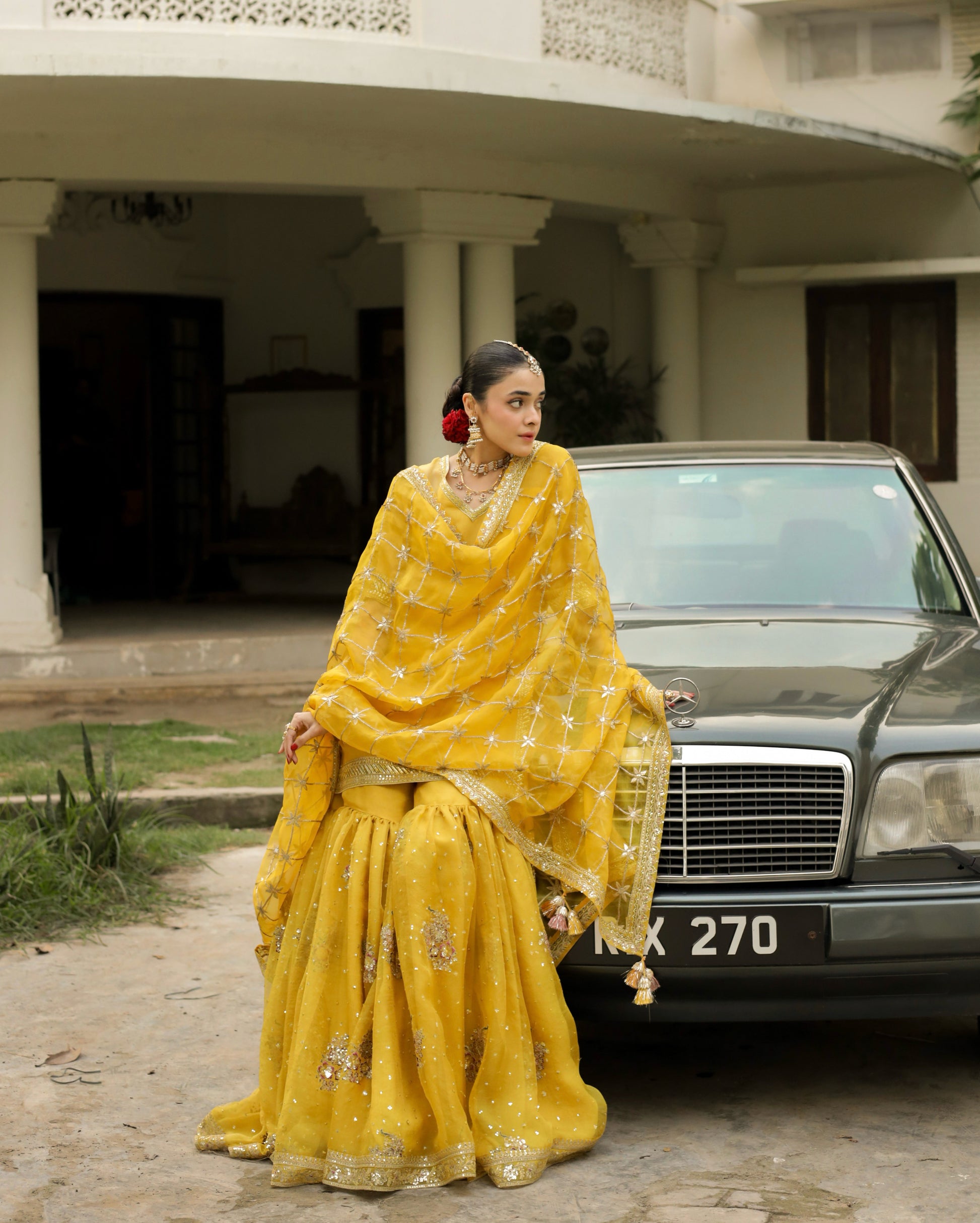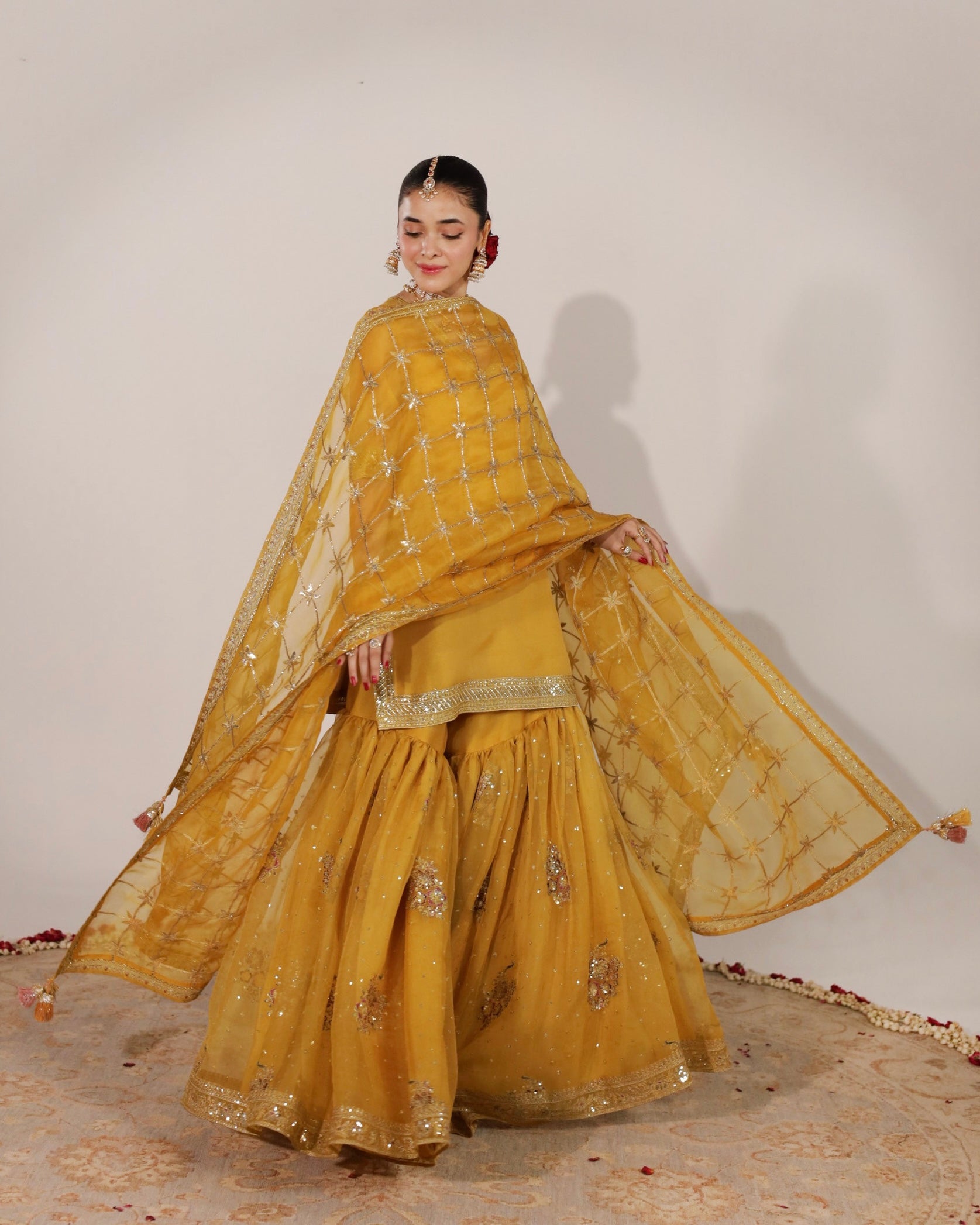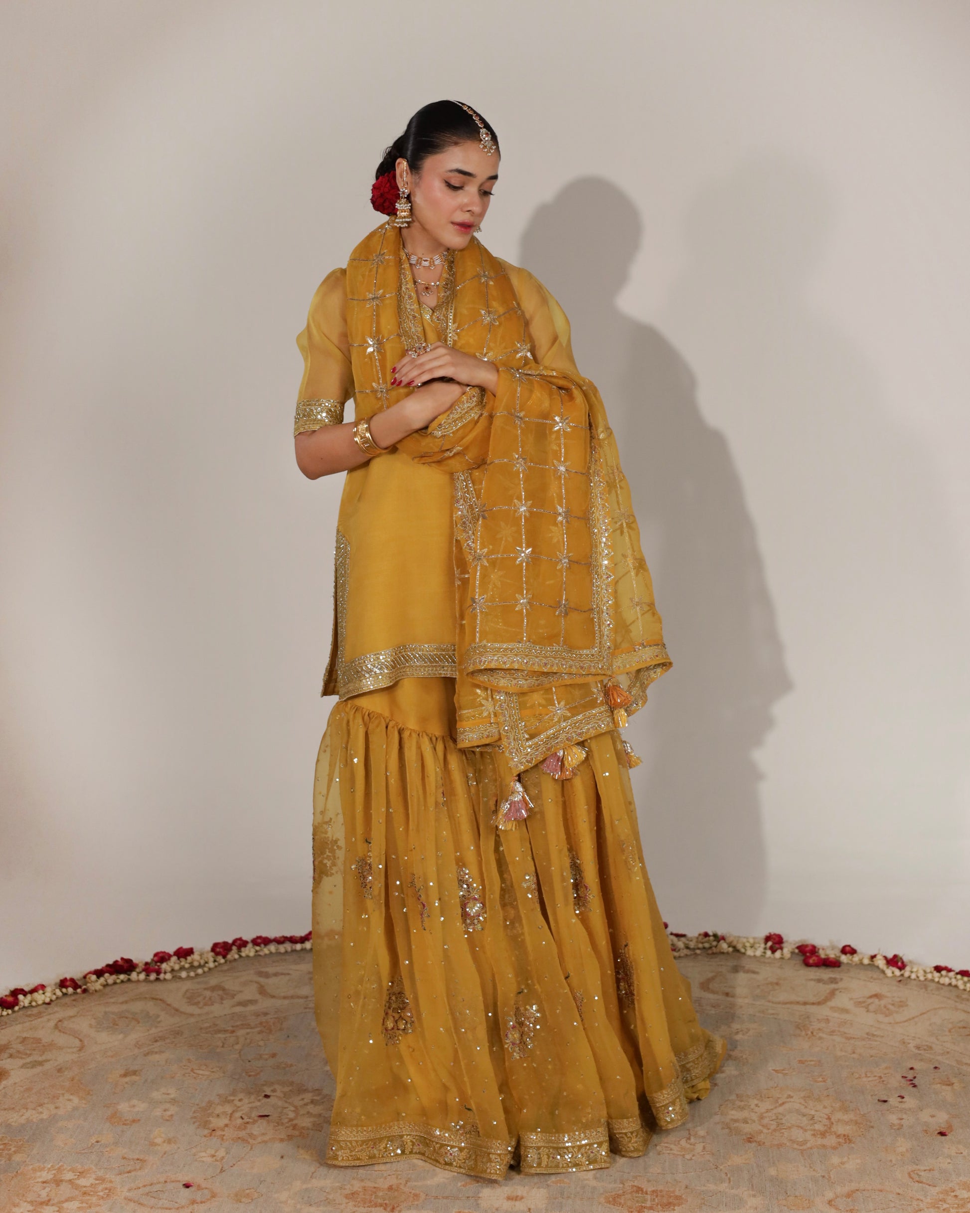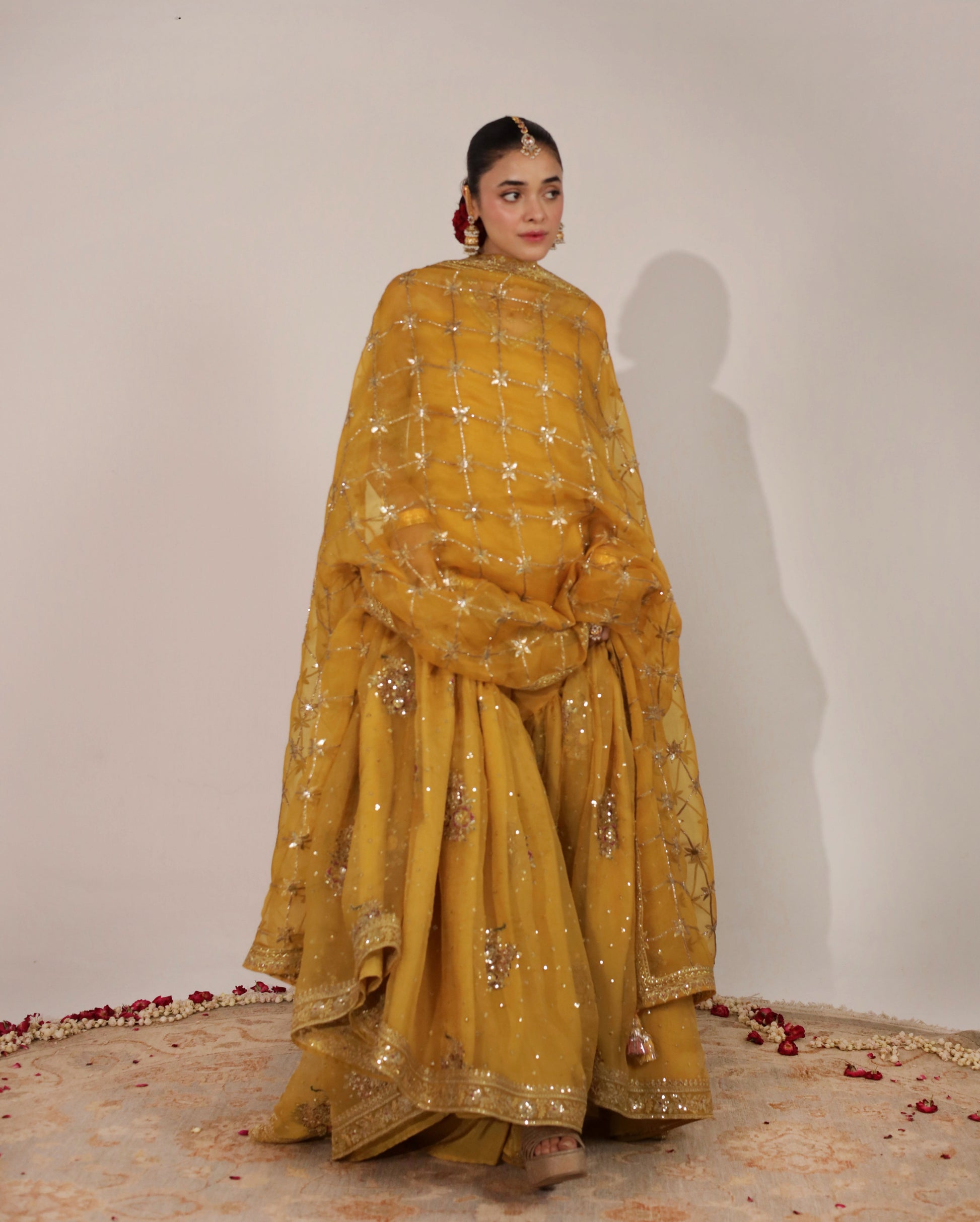 Material: Organza With Bambar Silk. 2-Pc (Straight Kameez & Gharara)Dandelion Yellow organza shirt and gharara with tilla, resham, sequin and badla embroidery paired with an organza adda work dupatta.