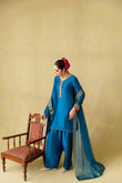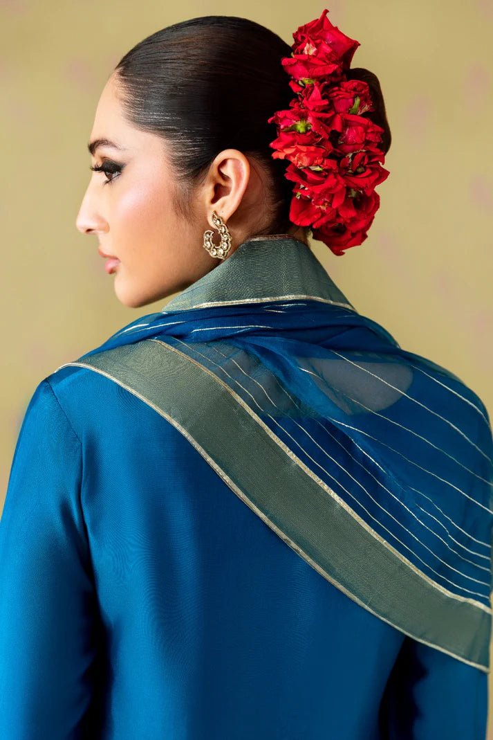 -Lining- for comfort-Copper Embroidery with floral patterns-Lace Details on the neckline and sleeves-Gold Piping- for a refined finish Paired with a light organza dupatta adorned with elegant golden lines, this outfit exudes graceful, traditional desi style. Perfect for any festive occasion.