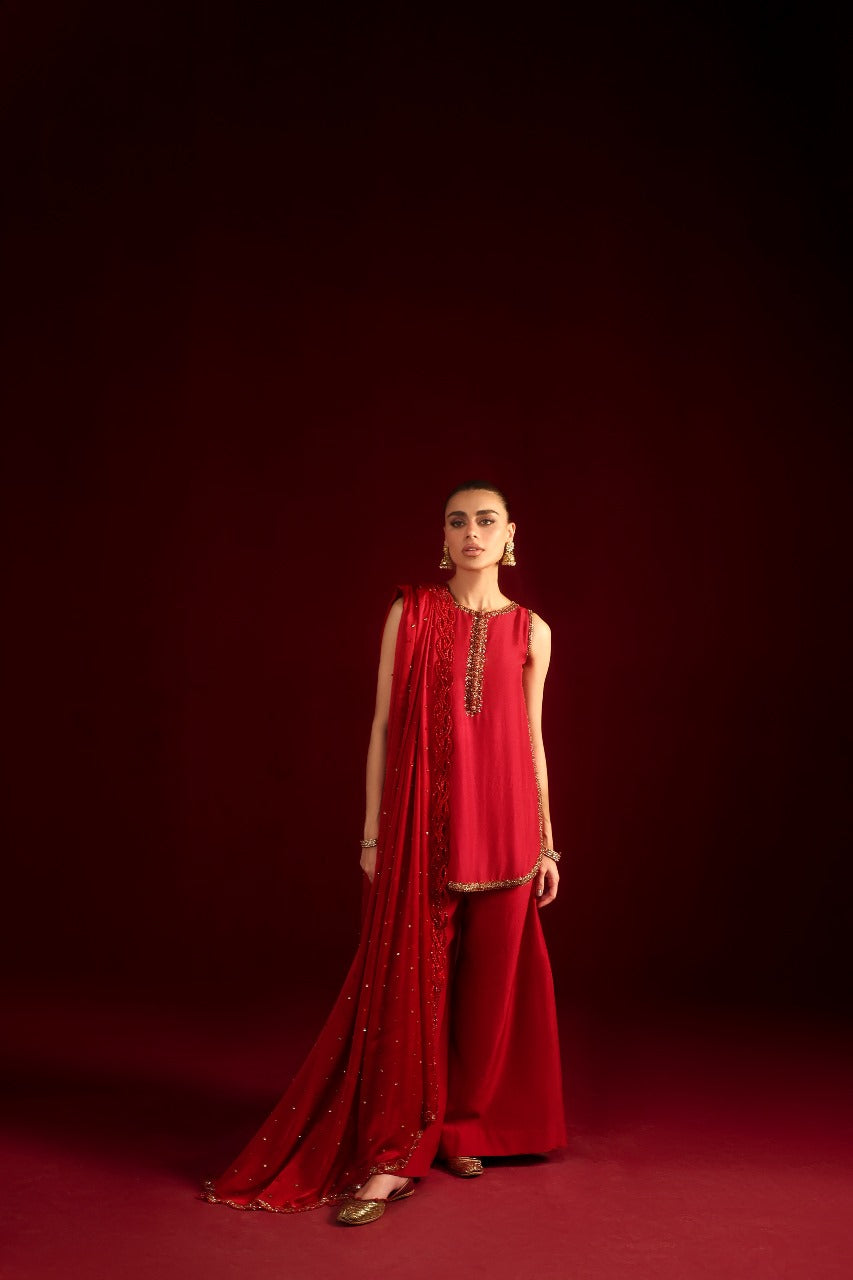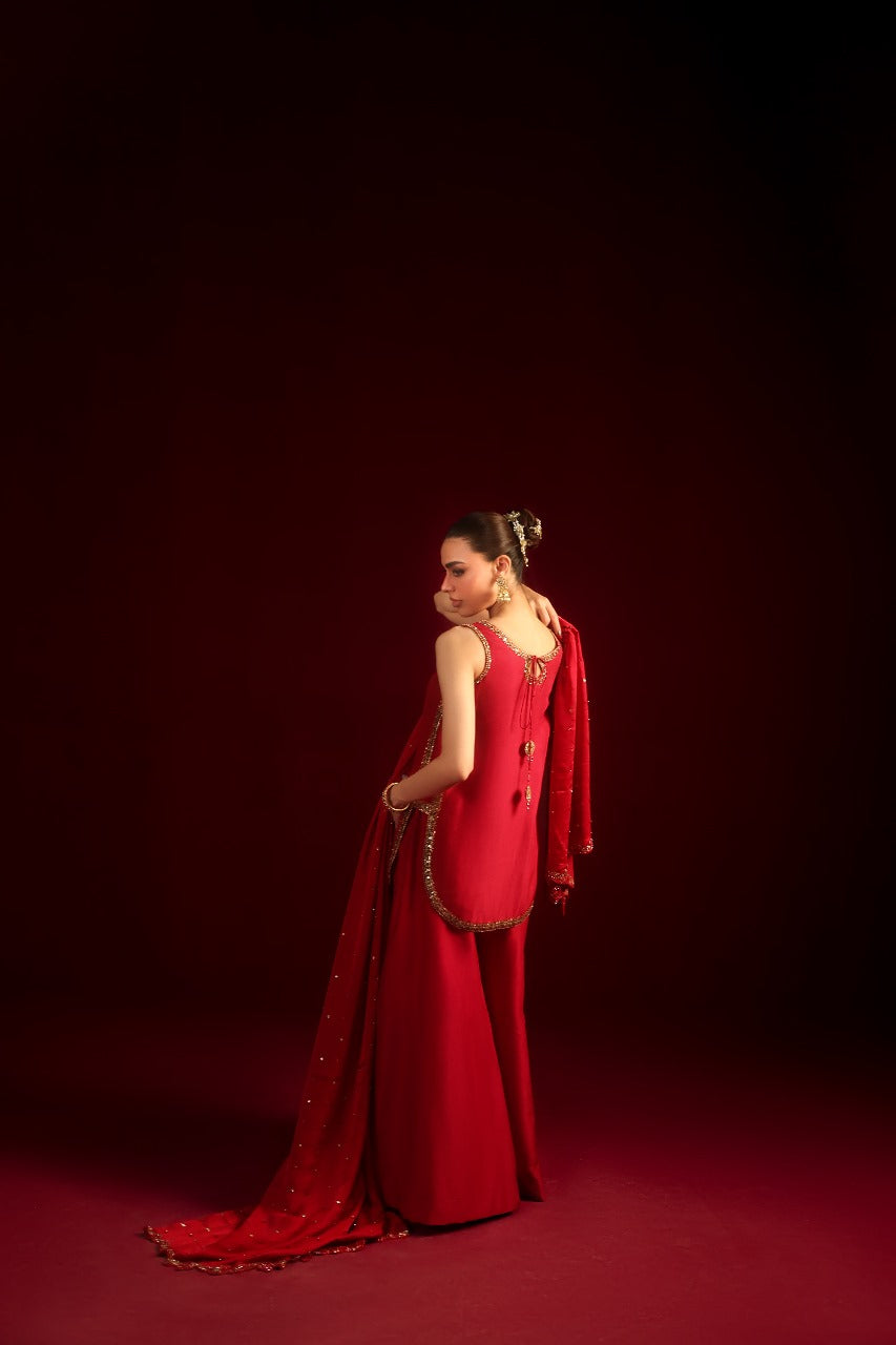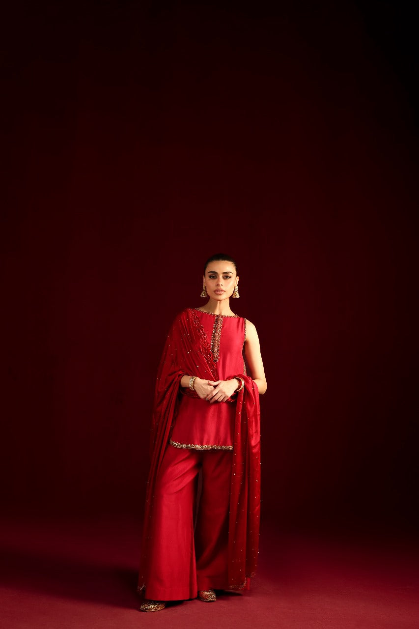 Introducing Eshal, designed for the chic modern woman. This super-trendy short shirt is crafted in luxurious raw silk, featuring a graceful round hem and drenched in intricate hand embellishments. The statement neckline adds a bold yet refined touch, perfectly balanced with tailored boot-cut pants. The look is completed with a stunning dupatta, beautifully accented with delicate handwork detailing for an effortlessly sophisticated finish.