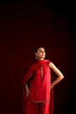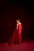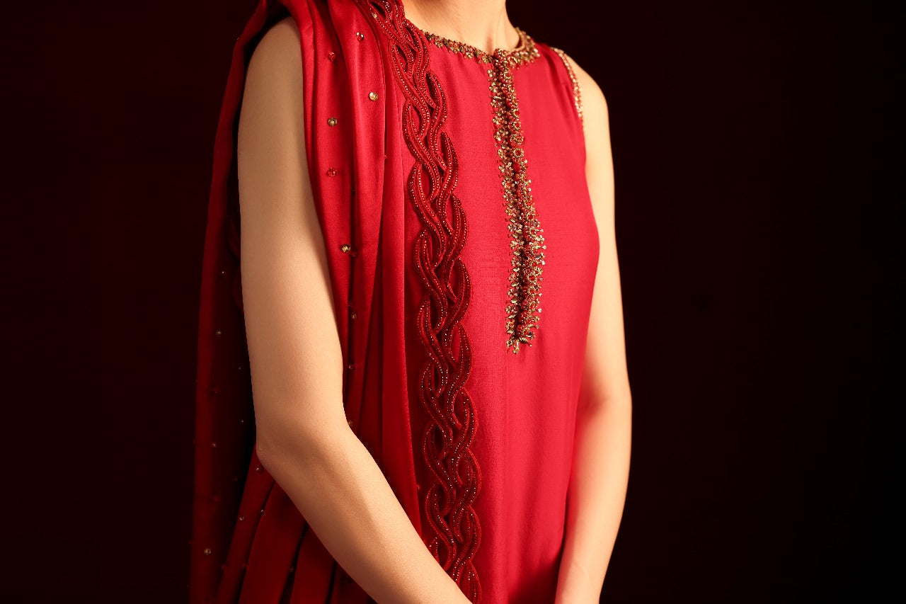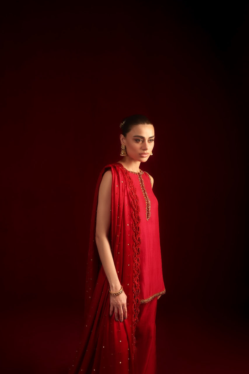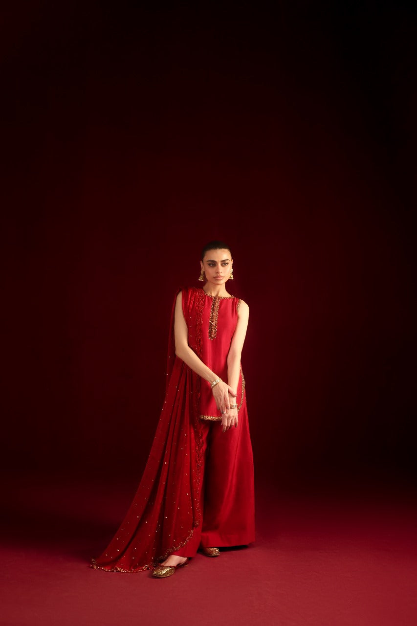 Introducing Eshal, designed for the chic modern woman. This super-trendy short shirt is crafted in luxurious raw silk, featuring a graceful round hem and drenched in intricate hand embellishments. The statement neckline adds a bold yet refined touch, perfectly balanced with tailored boot-cut pants. The look is completed with a stunning dupatta, beautifully accented with delicate handwork detailing for an effortlessly sophisticated finish.