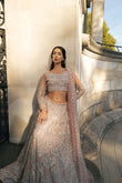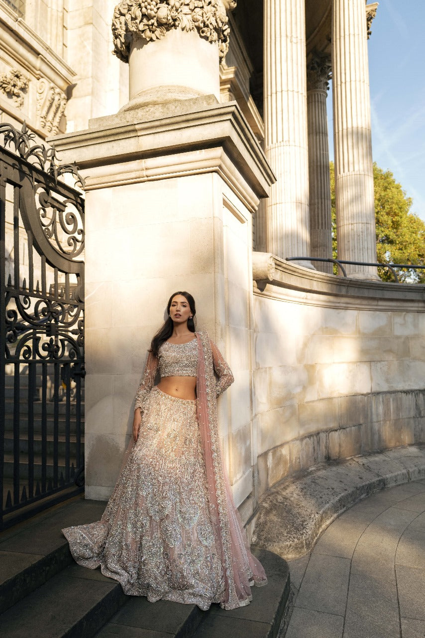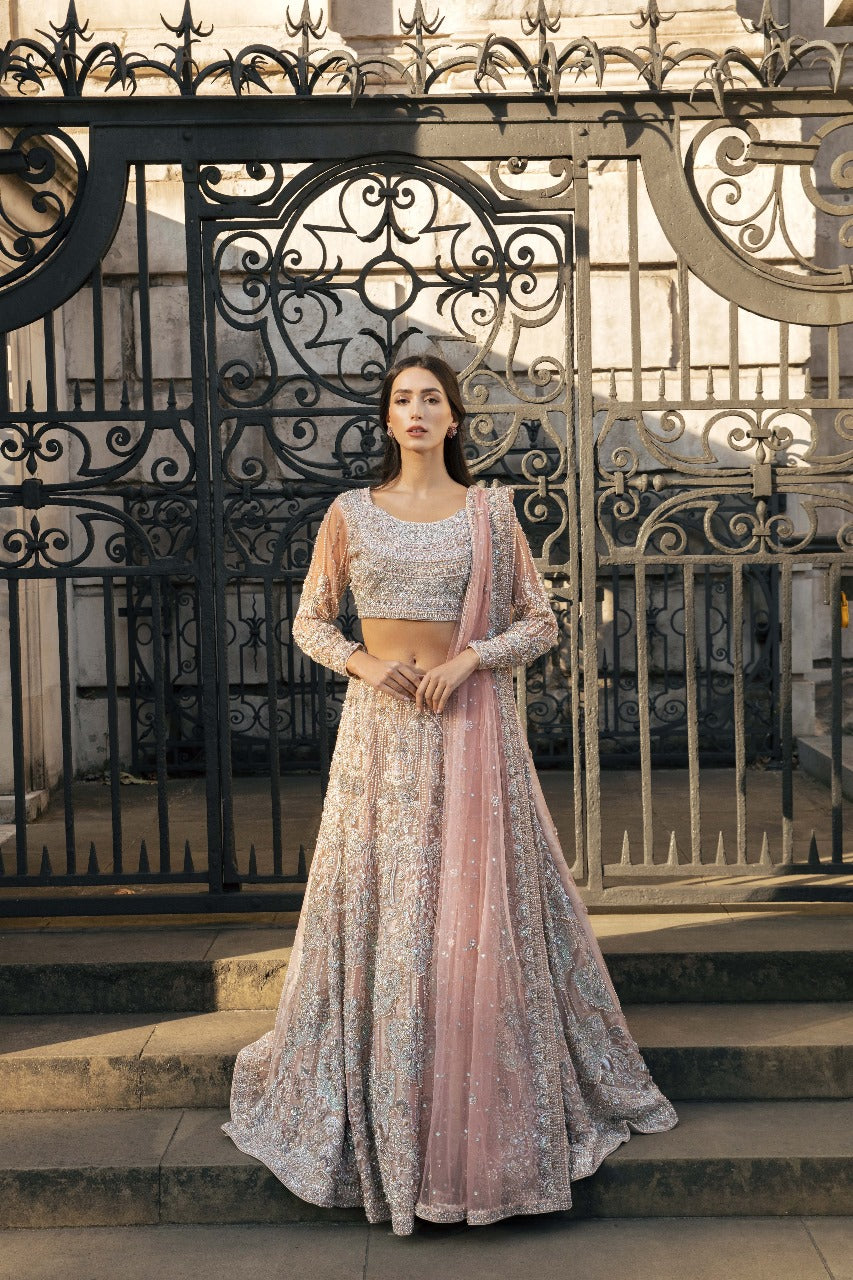 From the Khaab Bridal Collection, Elara captures the quiet glow of moonlight—soft, serene, and impossibly elegant. Designed in a delicate pastel pink hue, the ensemble is adorned with silver-white pearls and mint blue accent embellishments, creating a dreamy harmony of color and craft.