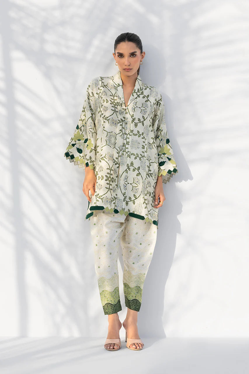 Paired with a tapered raw silk shalwar in a coordinating botanical print, the outfit is finished with a striking, patterned green border at the cuff — creating a perfectly balanced fusion of softness, structure, and seasonal charm.