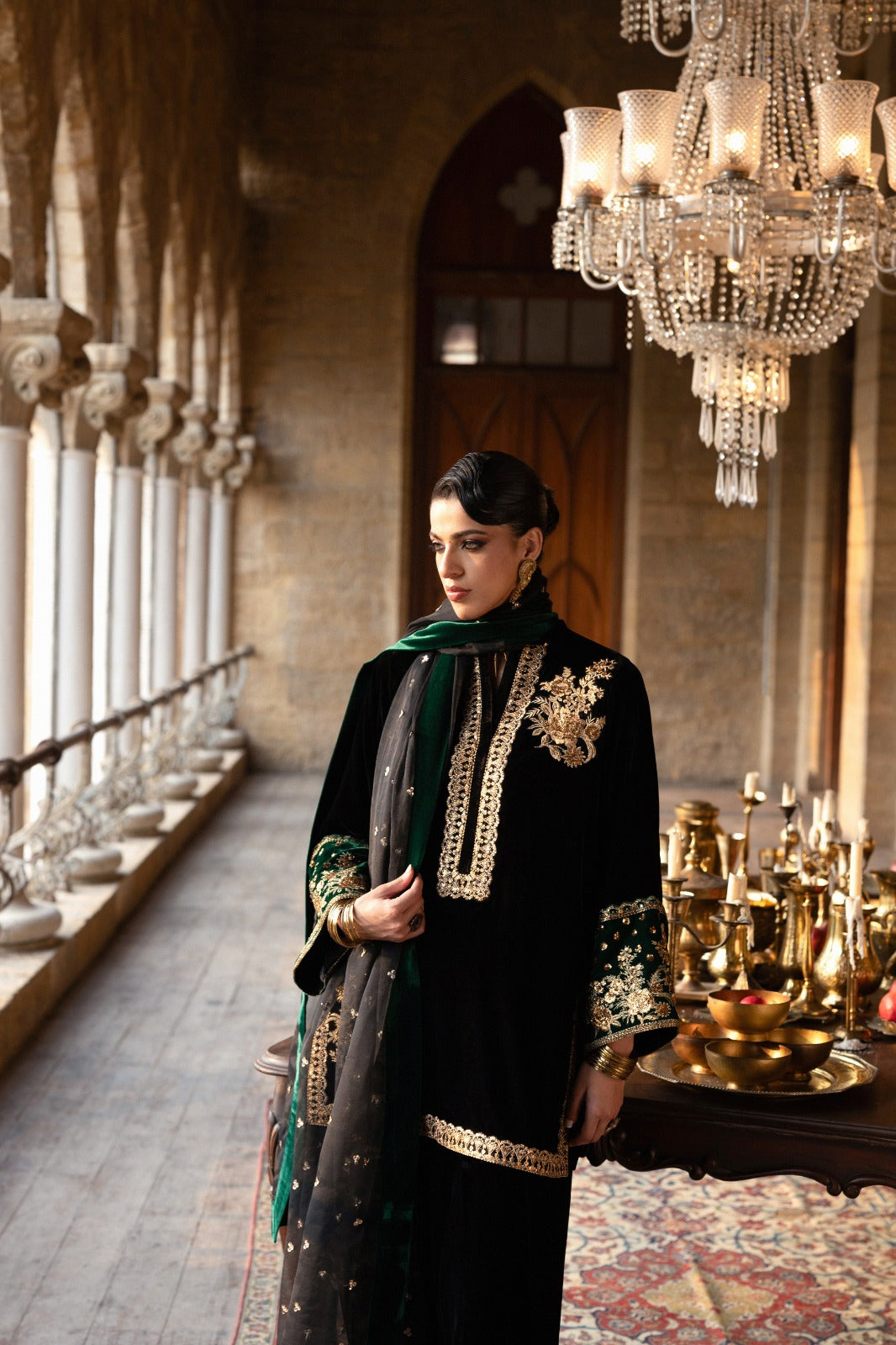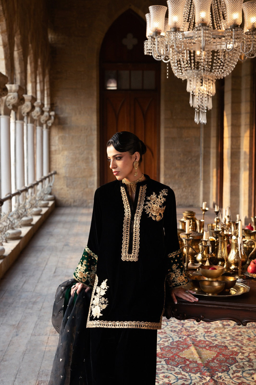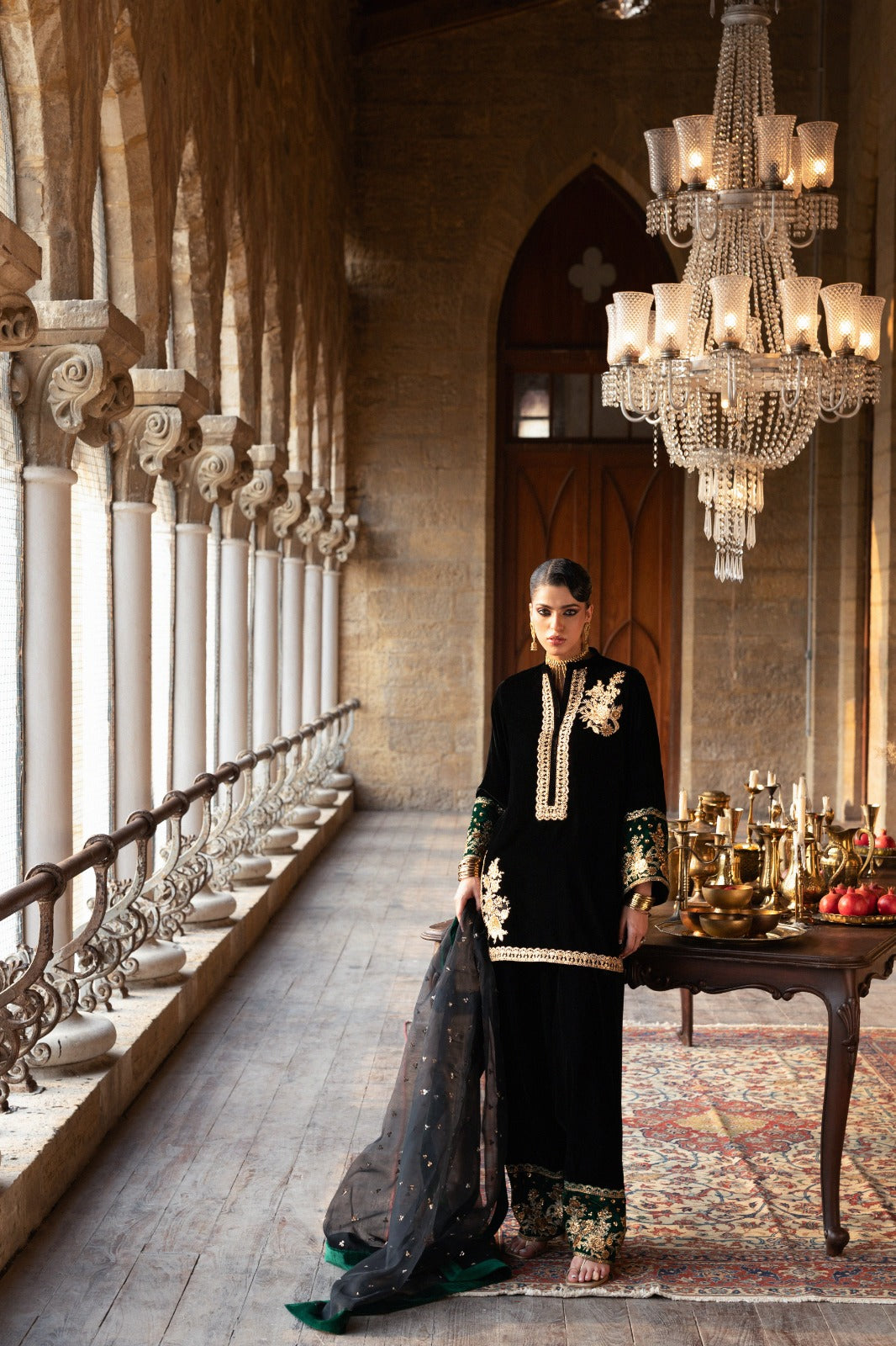 The look is completed with matching velvet farshi pants and a sheer black organza dupatta, delicately finished with subtle chan detailing, bringing together tradition, luxury, and understated glamour.