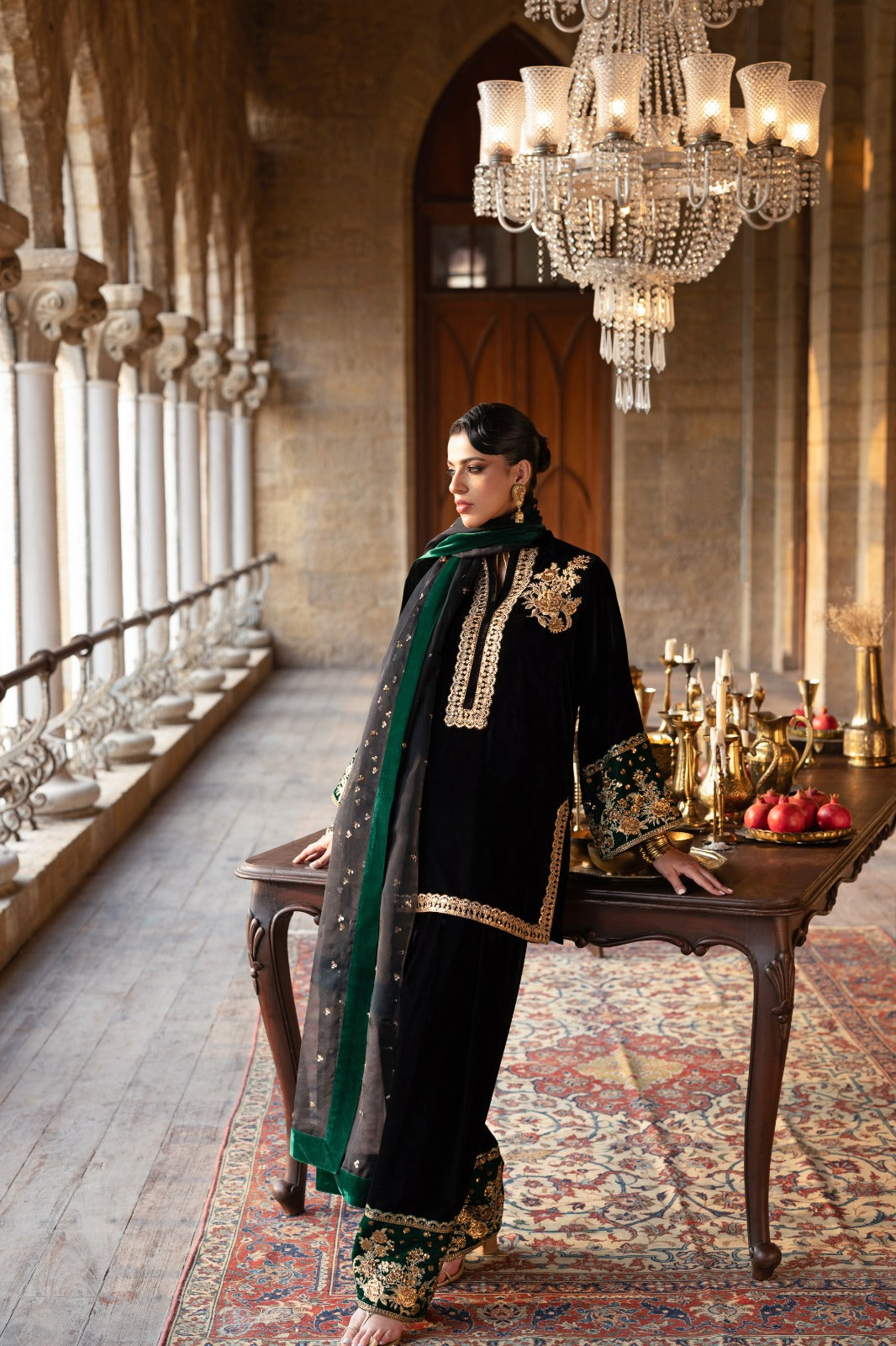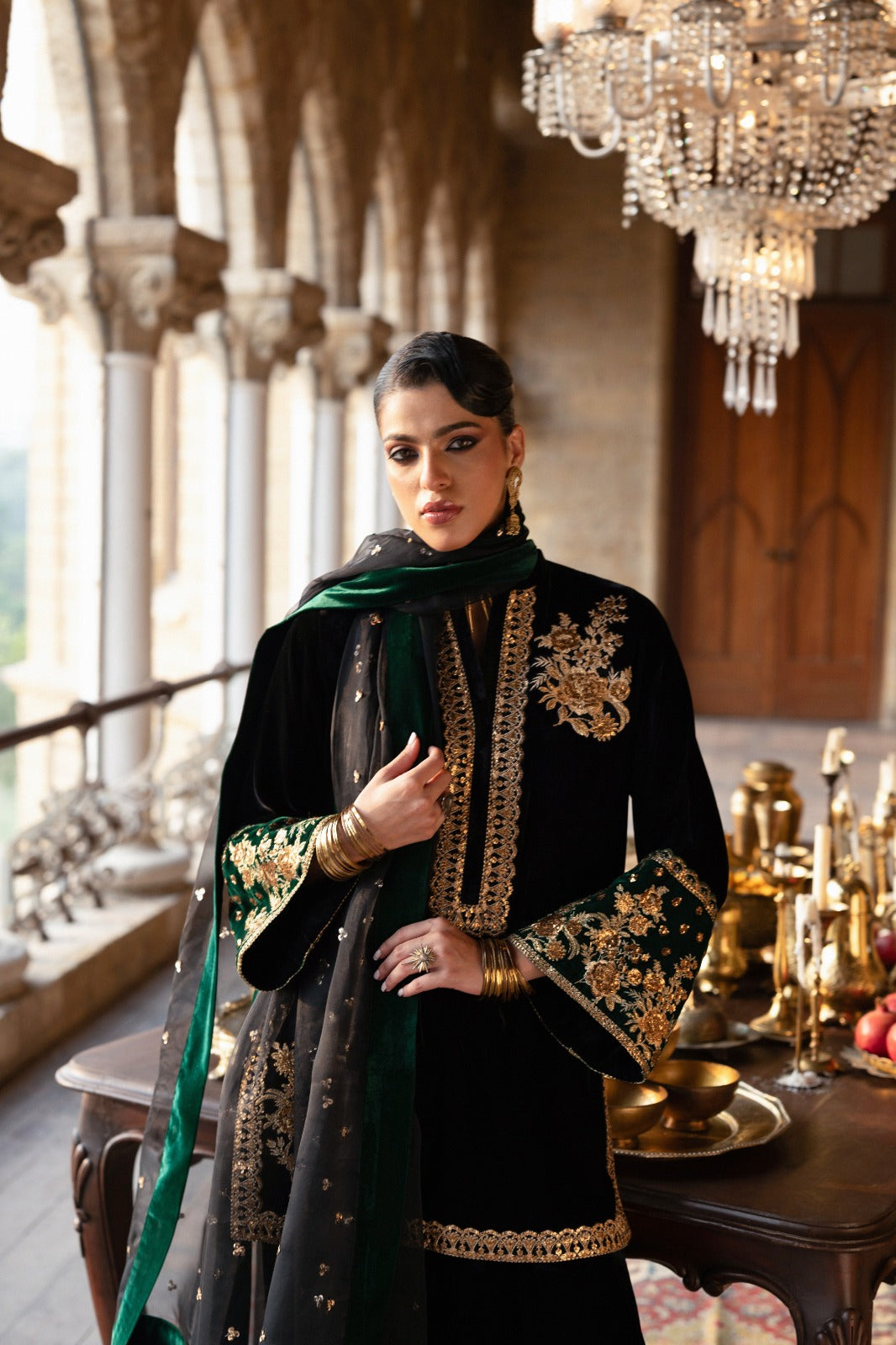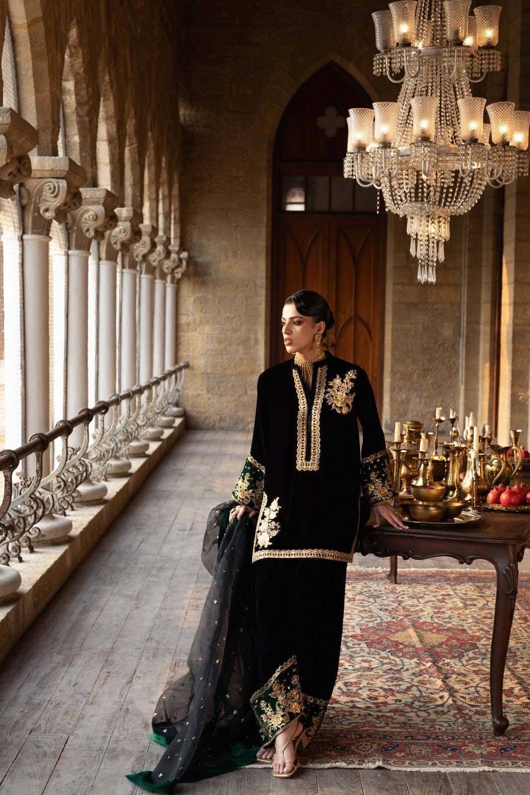 The look is completed with matching velvet farshi pants and a sheer black organza dupatta, delicately finished with subtle chan detailing, bringing together tradition, luxury, and understated glamour.