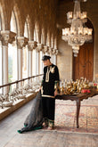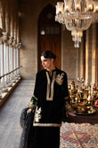 Adorn yourself in the timeless elegance of Emel Farshi, a refined ensemble crafted from sumptuous black velvet. The sophisticated short kurta is exquisitely detailed with intricate gold embroidery, beautifully adorning the neckline, front, and cuffs with artisanal finesse.