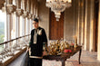 A grand floral gold motif enhances the back, adding depth and drama to the design, while a striking emerald green velvet border enriched with complementary gold embroidery elegantly frames the sleeves and hem, creating a bold yet regal contrast.