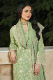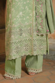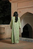 Feminine and unforgettable, "Esra" is a stunning three-piece outfit in pistachio green, crafted on a karandi canvas. The shirt is adorned with schiffli cutwork on the hem and sleeves, paired with matching trousers and a beautifully embroidered dupatta, making it the perfect seasonal outfit.