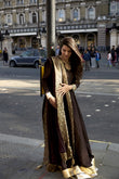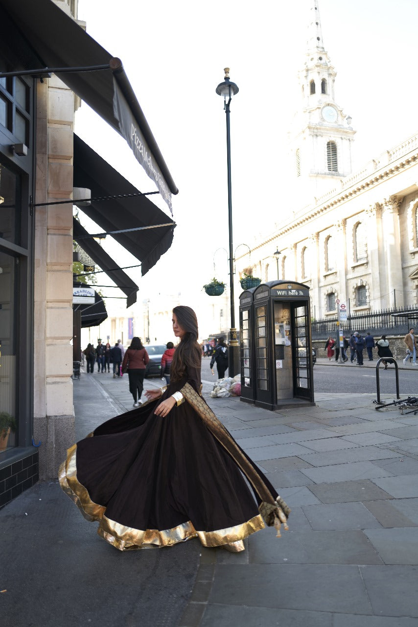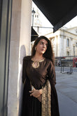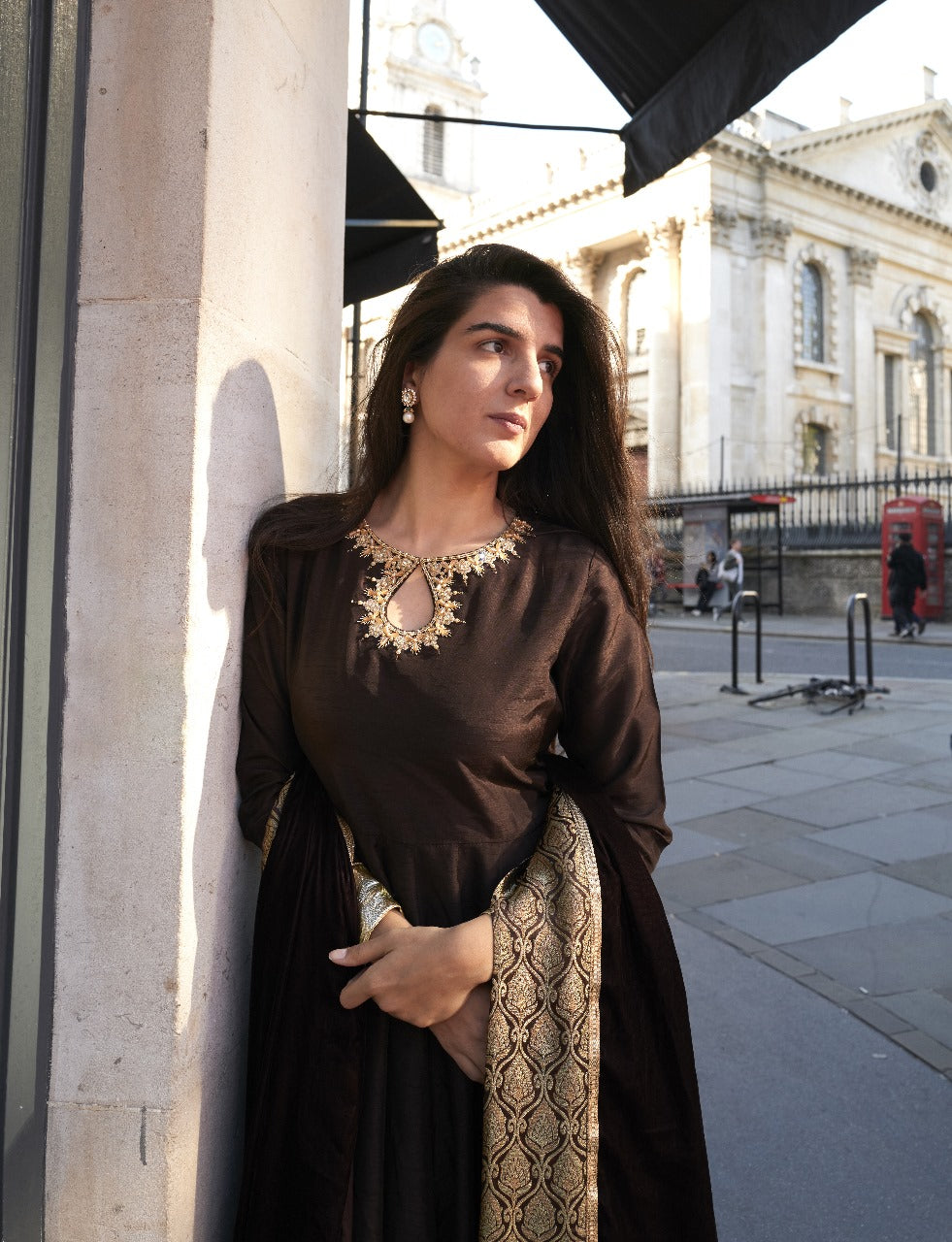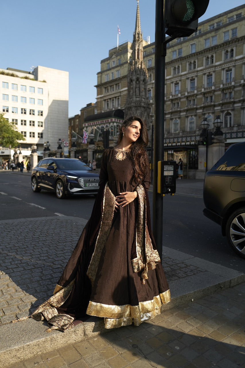 Florence features a two-layered Korean silk pishwas in a delicate chocolate brown hue, adorned with intricate adda work on the neckline and lappa borders. It is paired with a velvet shawl embellished with lace and tassel details, creating a rich and elegant ensemble.