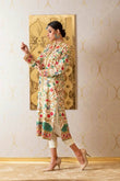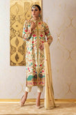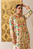 A bold and regal ensemble. The front open shirt is adorned with miniature hand embroidery and Swarovski. Intricately woven with fine detailing and sprawling artwork, the look is completed with sublime border and boti on dupatta.