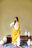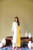 A chic long shirt paired with straight trousers, where the highlight is the vibrant yellow lace sleeves adorned with intricate gotta work and shimmering sequins. The neckline is elegantly detailed with buttons that add a touch of sophistication. To complete this stunning ensemble, an exquisite jamawar dupatta drapes gracefully, enhancing the overall allure and making it perfect for any festive occasion.
