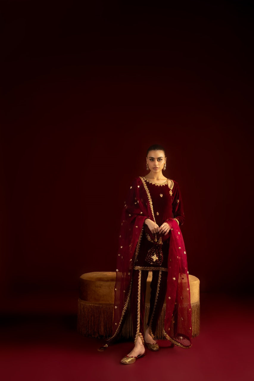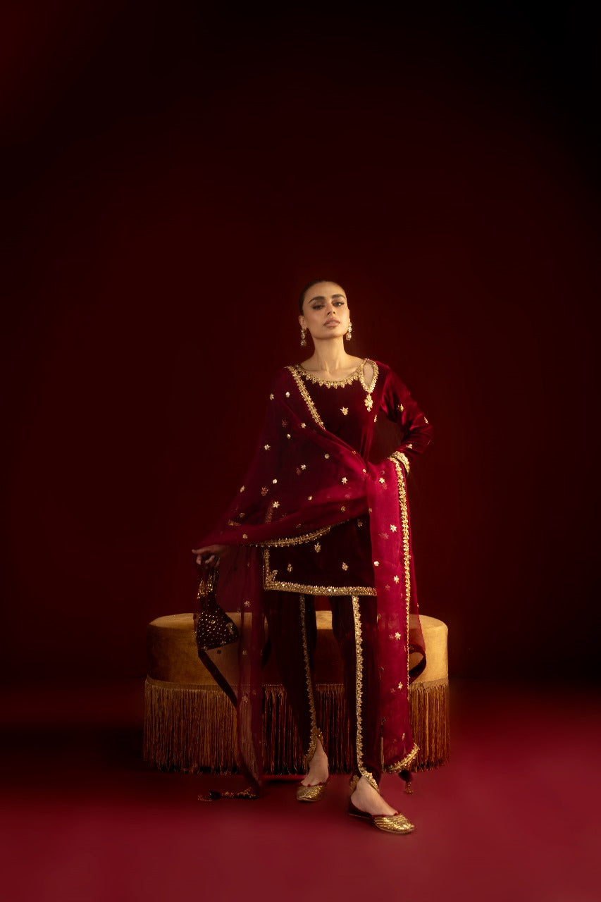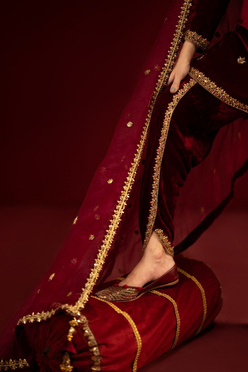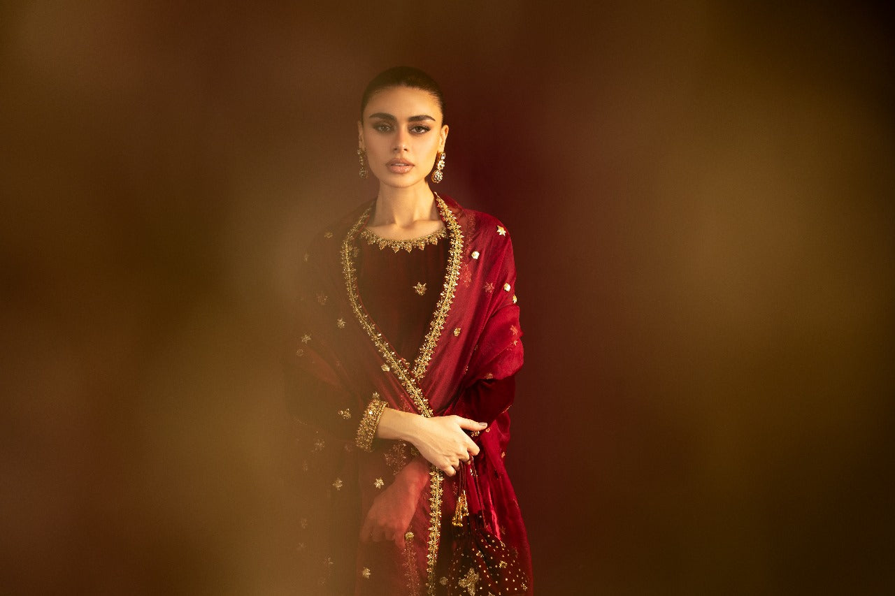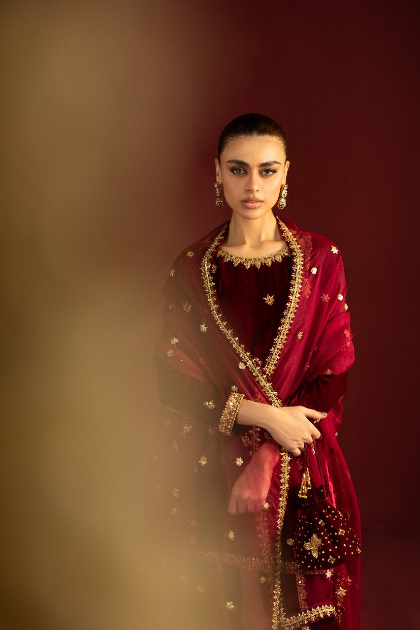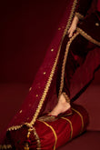 The Hani Set features a modern-cut neckline, beautifully detailed with intricate hand embellishments and delicate botis for a refined finish. Paired with a graceful dupatta accented with elegant tassel detailing, this ensemble exudes understated luxury and timeless charm perfect for festive and formal occasions.