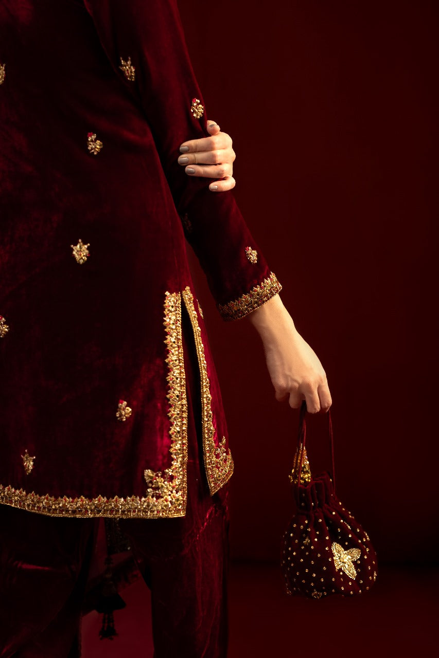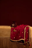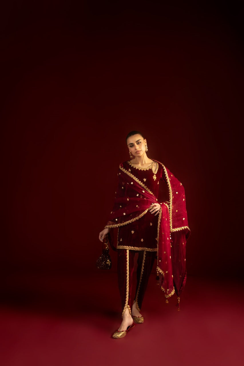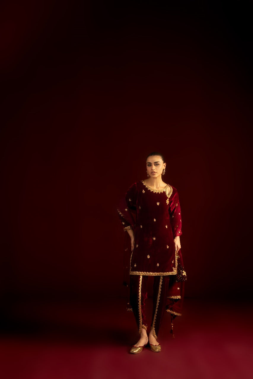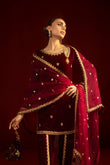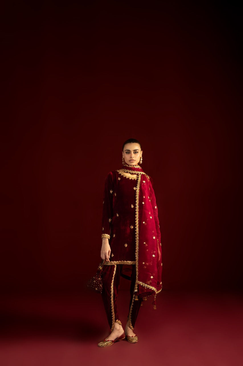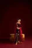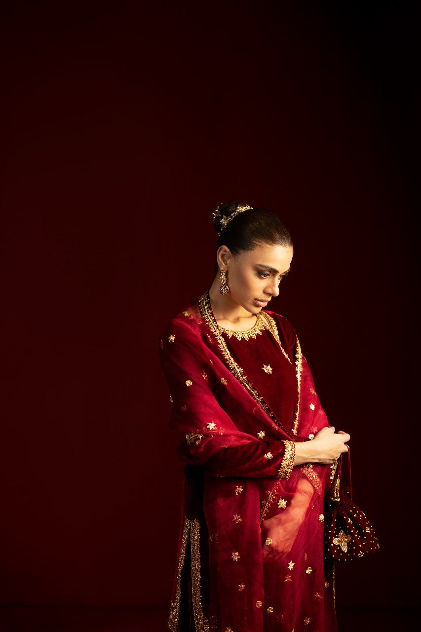 The Hani Set features a modern-cut neckline, beautifully detailed with intricate hand embellishments and delicate botis for a refined finish. Paired with a graceful dupatta accented with elegant tassel detailing, this ensemble exudes understated luxury and timeless charm perfect for festive and formal occasions.