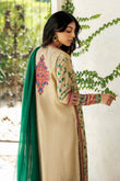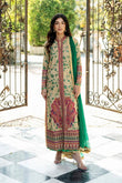 The luxurious front open raw silk shirt is adorned with intricate emerald green Kashmiri embroidery. Two vibrant floral bunches add pops of color, while colorful border graces the hemline. The sleeves are elegantly finished with colorful embroidered borders, adding a touch of sophistication. The look is completed with a pair of plain raw silk pants & a pure chiffon dupatta, finished with a delicate jamawar border, adding a touch of ethereal charm.