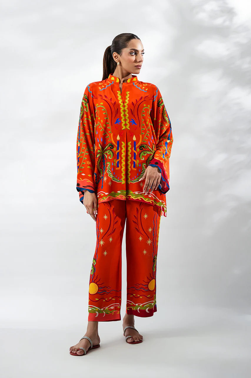 The coordinated crepe culottes mirror the shirt’s artistry, featuring sun and palm motifs accenting the hems — creating a seamless, statement-making look that balances modern ease with expressive design.