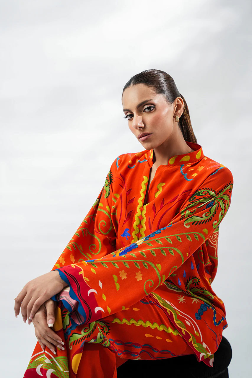 This relaxed-fit top is brought to life with a vivid tropical–celestial inspired print, merging vibrant tones of tangerine, cobalt, lime, and gold for a dynamic visual impact. The sleek band collar and delicately scalloped sleeves add refined structure to the fluid silhouette.