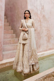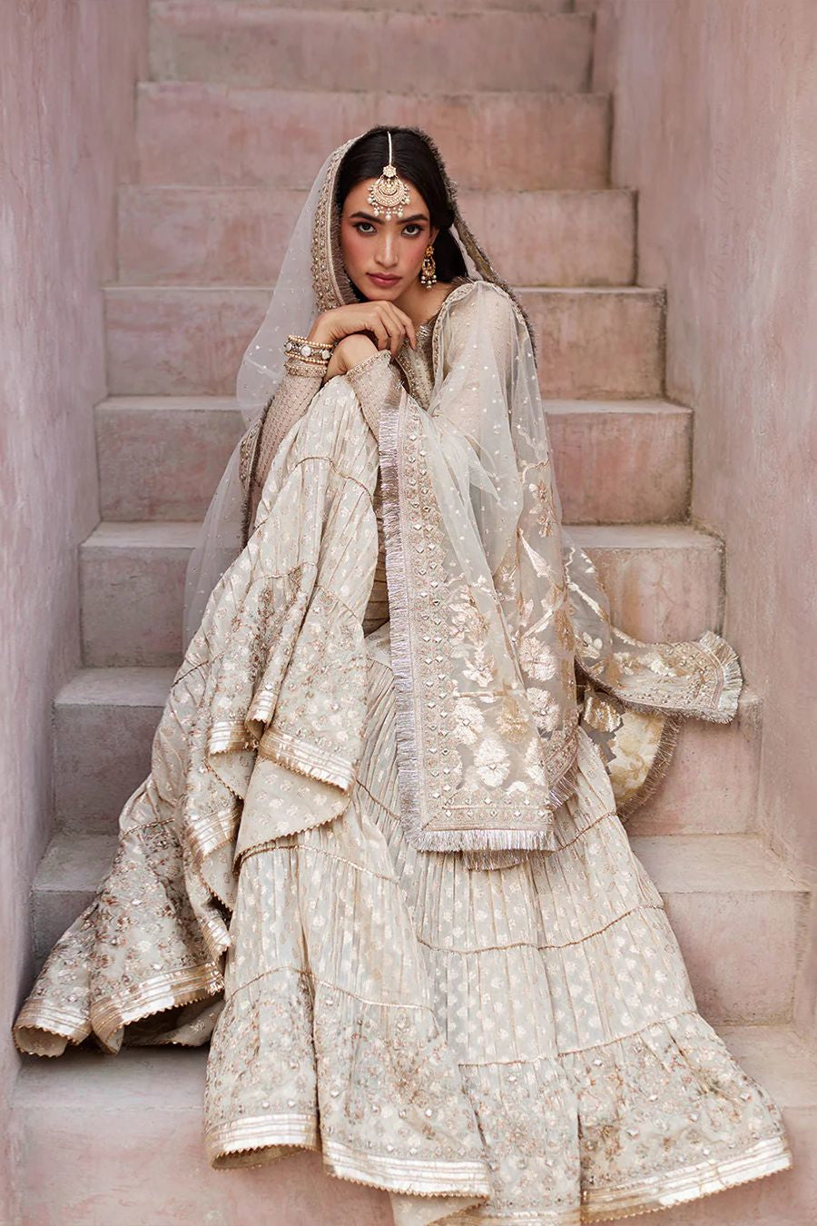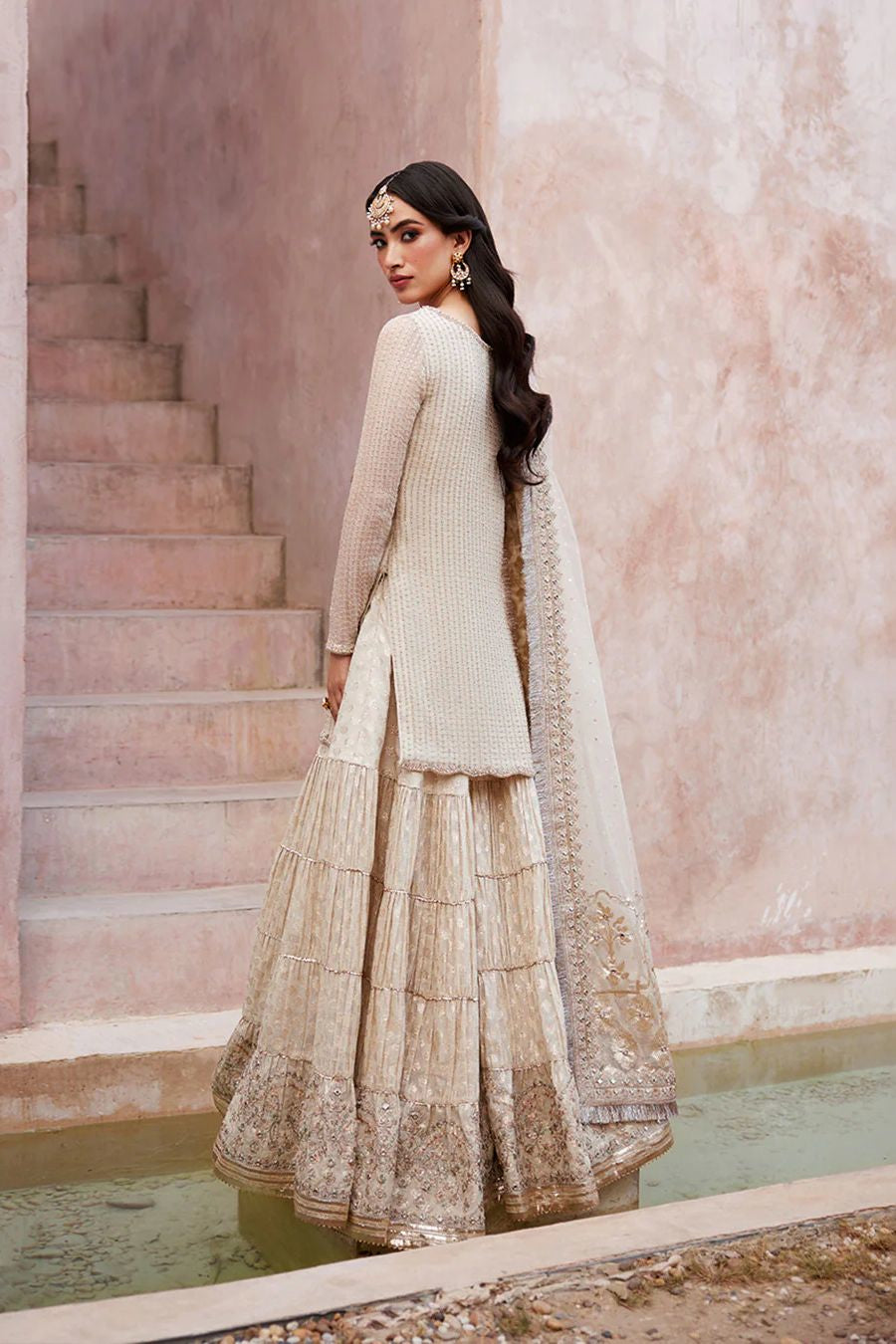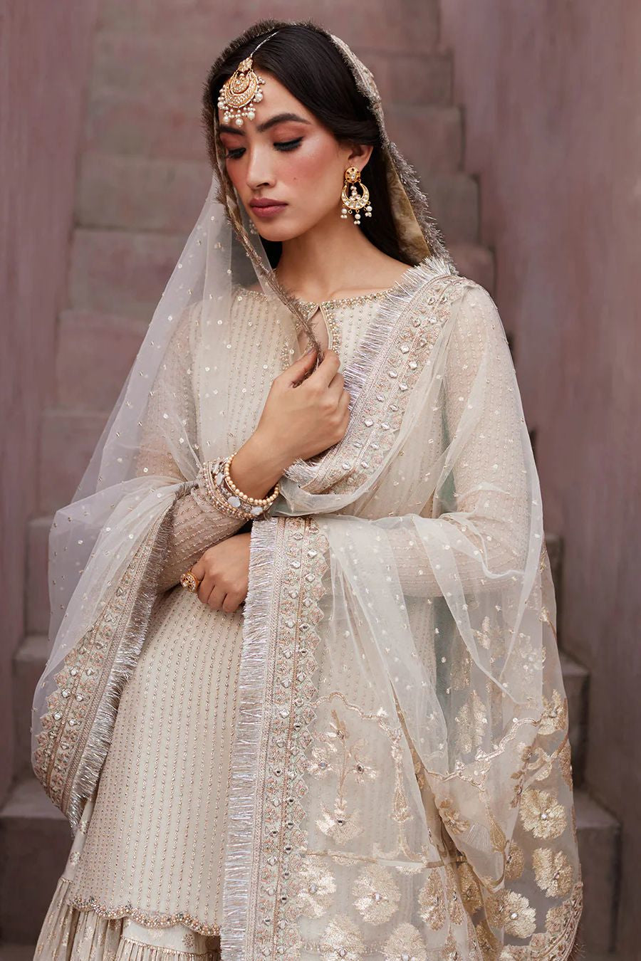 Exploring classic silhouettes, Kaia is a masterpiece. The off-white chiffon shirt and karandi gharara feature uniquely designed pearl and mirrorwork motifs for a truly majestic look. This set also includes an ornately adorned organza dupatta.
