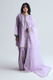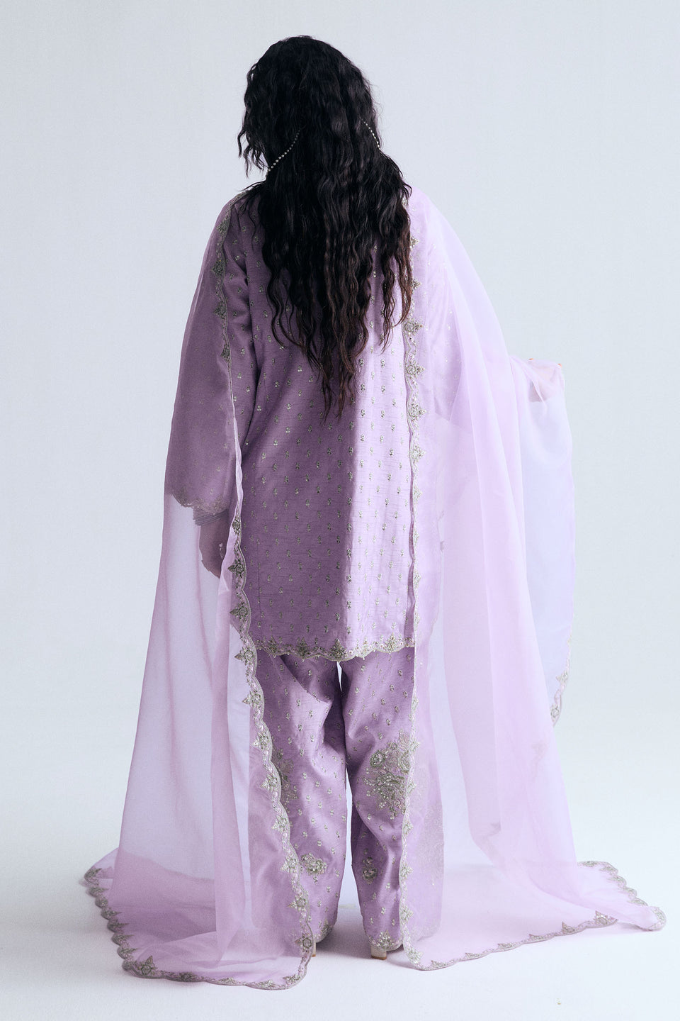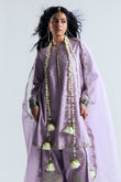 It is paired with a classic farshi shalwar, beautifully embellished with scattered botti and floral embroidery. The look is completed with a lavender organza dupatta, finished with embroidered scalloped edges for a graceful, cohesive finish.