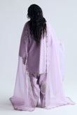 Khusboo is a soft lavender three-panel shirt adorned with an all-over botti spray and delicate adda work, featuring elegant loop-button detailing along the neckline. The sleeves and hem are gently framed with small floral embroidered motifs, adding subtle charm.